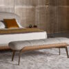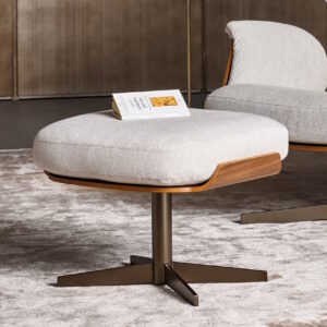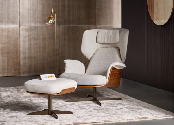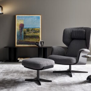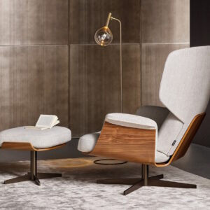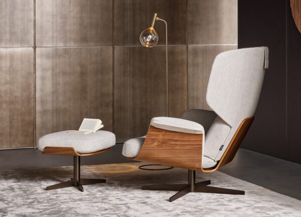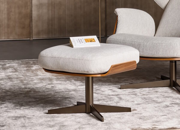 A deep comfortable padded cushion is supported by a wood frame in either canaletto walnut or coal oak. The metal base is available in several finishes, including white, black, pearl gold or lead.