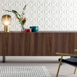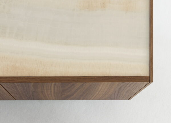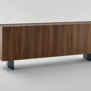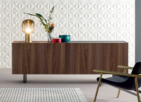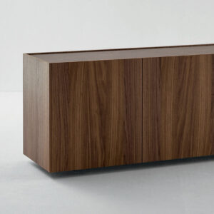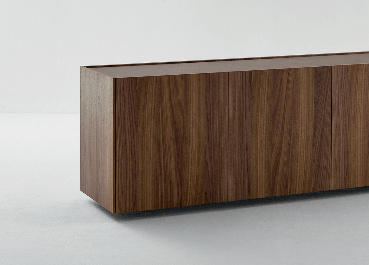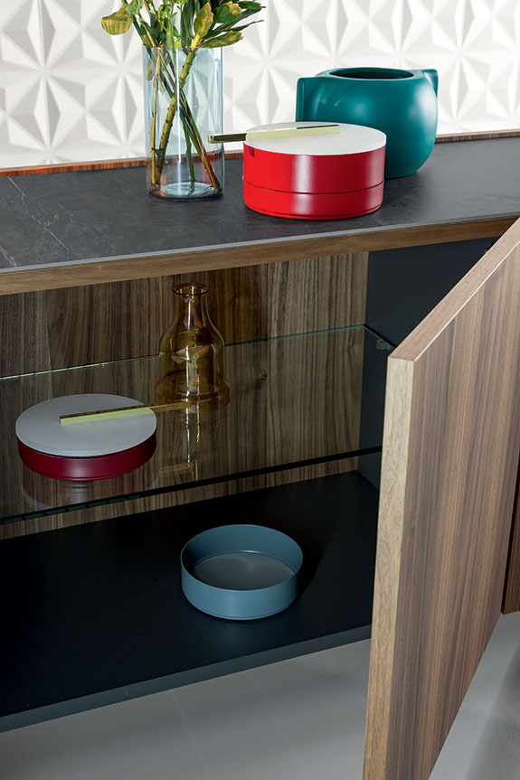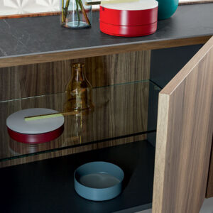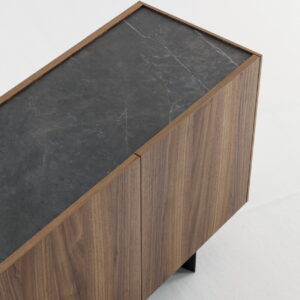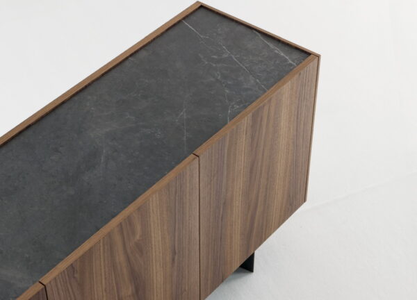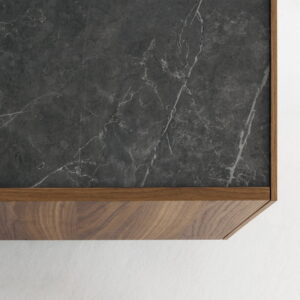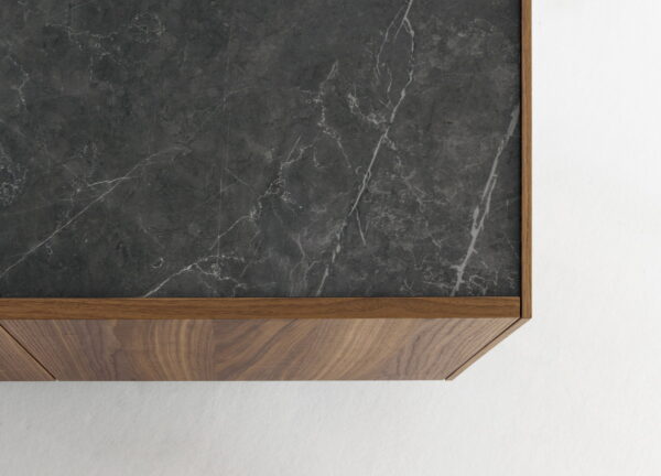For the sideboard top, which is slightly inset to emphasise the warmth and the quality of the wood, you can choose two different materials: either canaletto walnut to match the frame, or in ceramic to create an elegant contrast with the wooden frame.