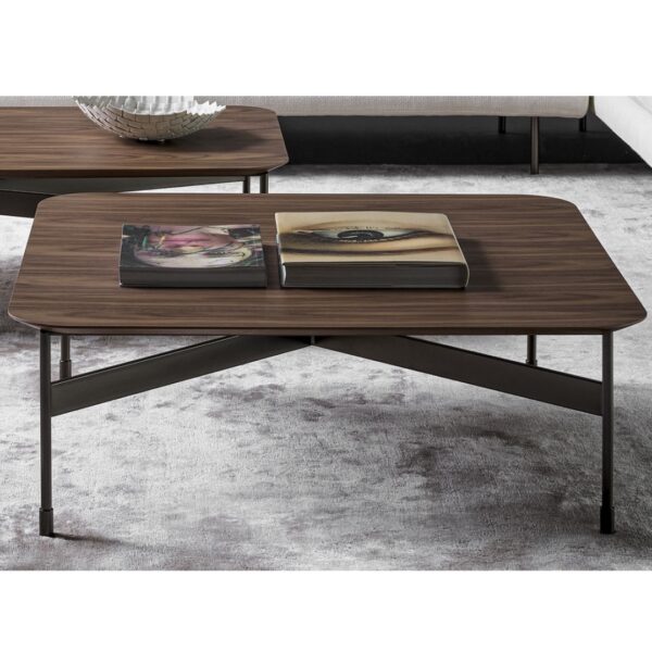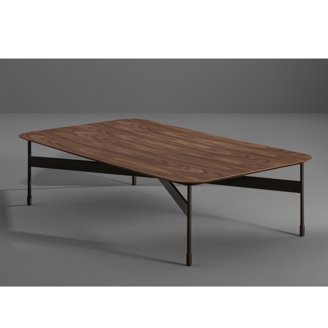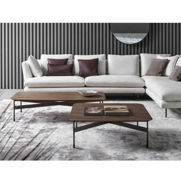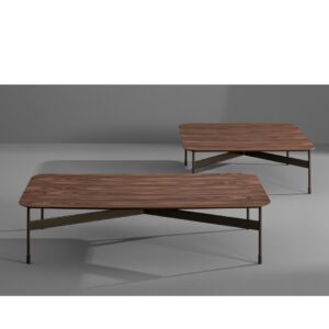 Available in two sizes, each table has a slender outline with a flared top section and thin metal legs. The diagonal buttressed base fulfills a twin role: on the one hand it reinforces the load bearing resistance, while on the other it sums up the style and sophistication of the piece. The tremendous attention to detail is revealed even in the smallest elements, such as the support feet which provide a sense of stability both physically and visually.