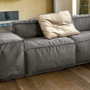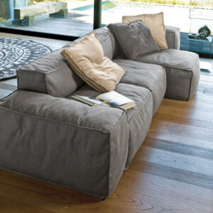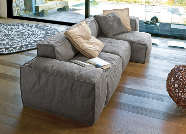 Extremely versatile the Peanut sofa will blend seamlessly into any space or style. The deep seats with white feather and polyurethane foam padding make it especially comfortable. Compositions can also include certain modules fitted with a sliding mechanism to extend the length of the seat, for further comfort.