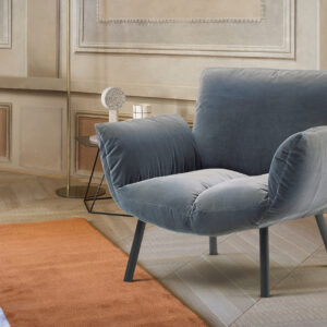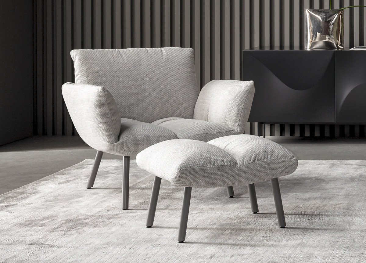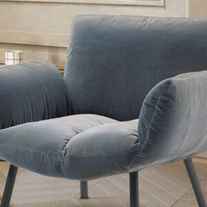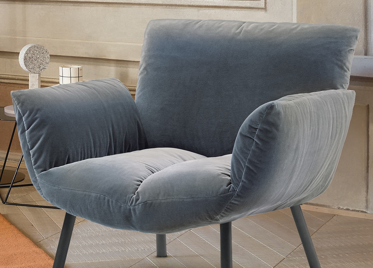 The main components of the Pil armchair are the armrests, the backrest cushion and the seat cushion. The latter features a fold in the middle, created to generate an enveloping effect that physically and visually emphasises the feeling of softness. The frame is matt lacquered metal, in several different finishes.