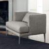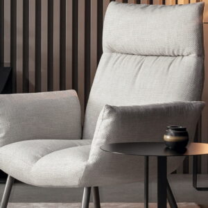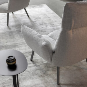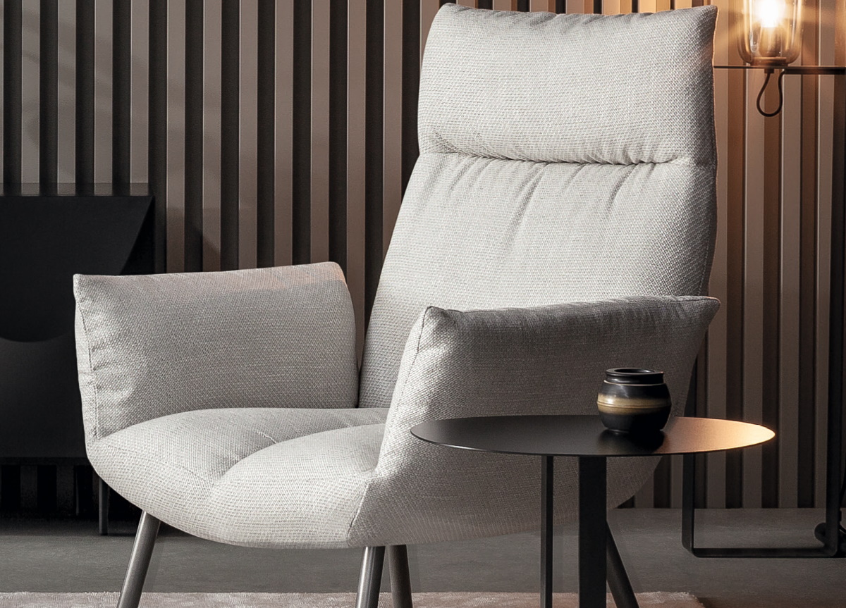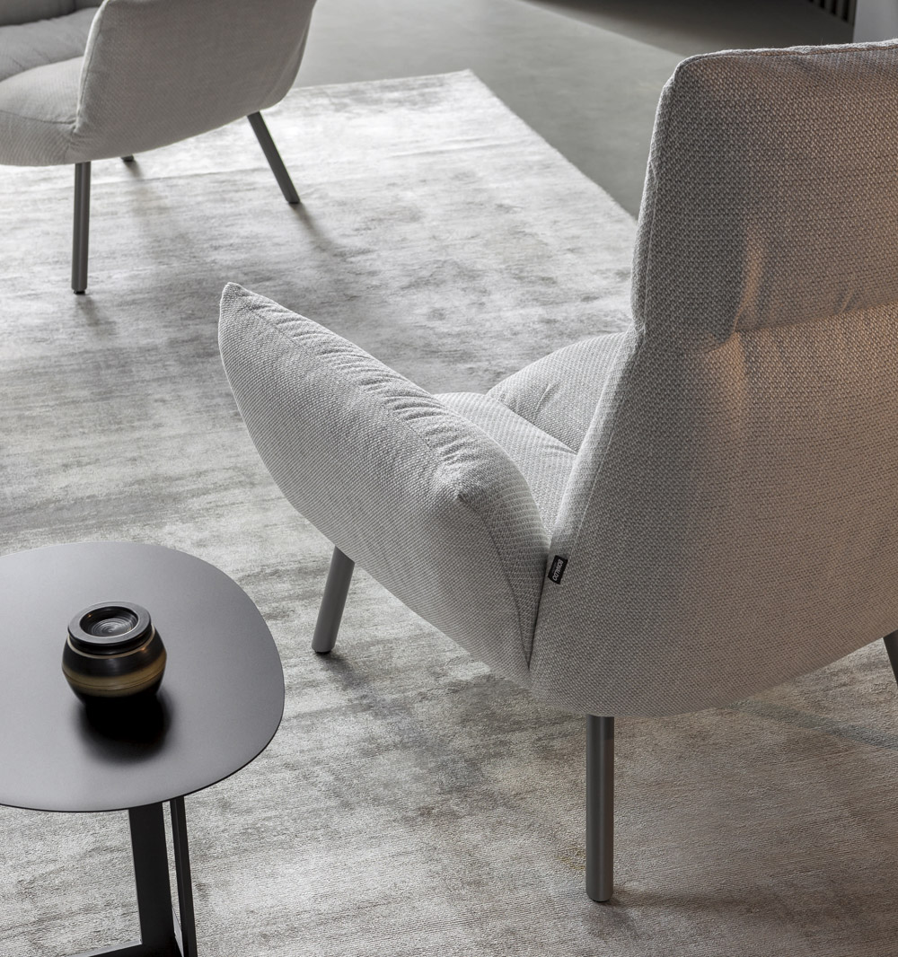 The main components of the Pil armchair are the armrests, the backrest cushion and the seat cushion. The latter features a fold in the middle, created to generate an enveloping effect that physically and visually emphasises the feeling of softness. The frame is matt lacquered metal, in several different finishes.