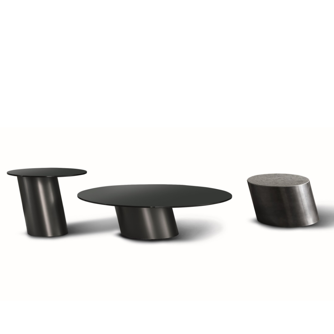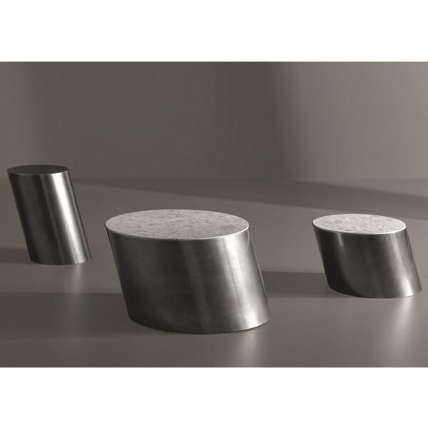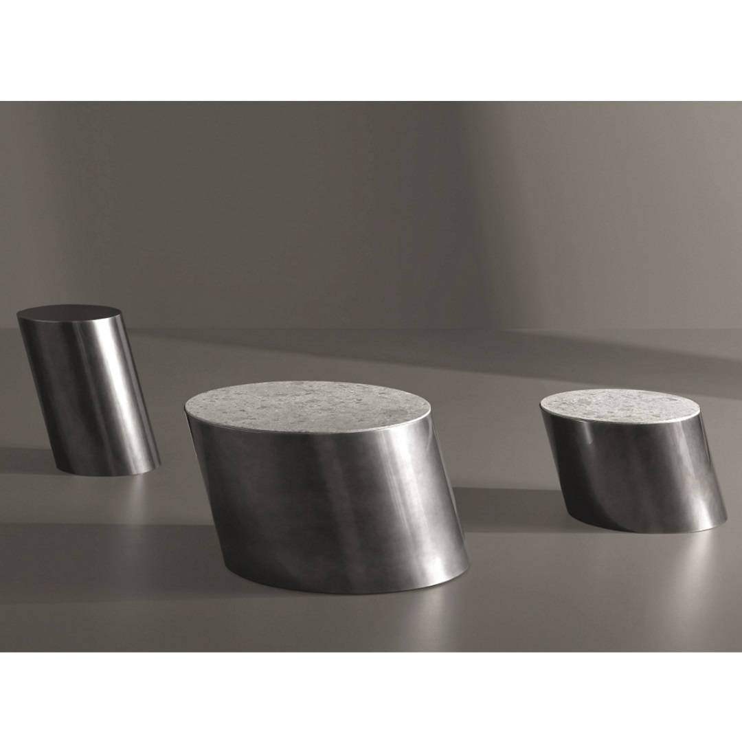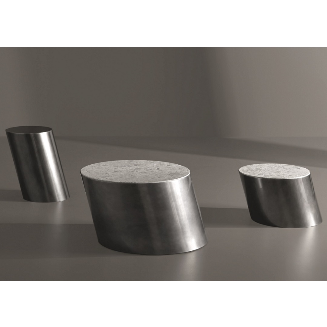 Available in three sizes, there are several options for the table top, it can be selected in metal to match the base or you can choose a ceramic or marble table top. The main image shows the Pisa coffee table with a stone grey ceramic table top and a clouded chrome base and with a clouded chrome table top and base