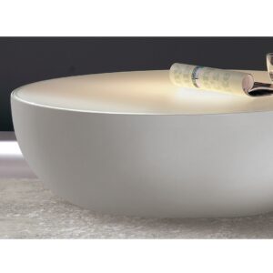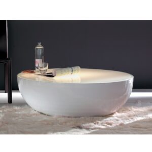 The table top is made in white extra light acid treated glass, which is a very clear glass, with no green tinge, so the white glass will look white, not green/white. A version of this table is also available without the light.