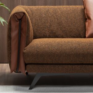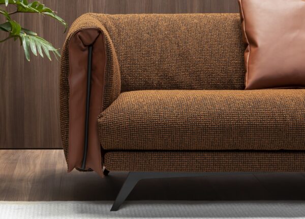 Saddle has a modern and functional style. The tub-shaped back and armrests recall the shape of a saddle and the padded seat make this sofa enjoyably soft. The aesthetic appeal is accentuated by the leather insert in the armrest, which defines its front and creates a high-impact optical effect. Metal feet in a range of matt colours lighten the shape of the sofa, emphasising its contemporary allure.