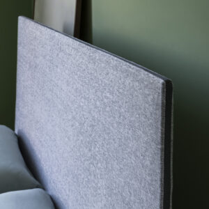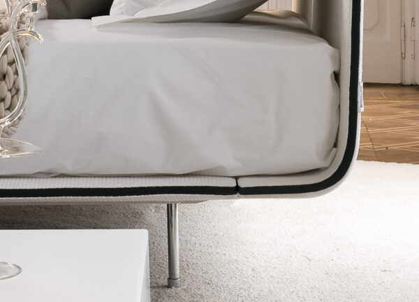 Designed to take up the minimum amount of room, the frame is just 7cm wider & 12cm longer than the mattress size. The legs are chromed metal, but can also be lacquered in a range of colours or metal finishes. The tape on the side edges is available in several colours.
