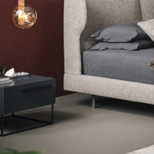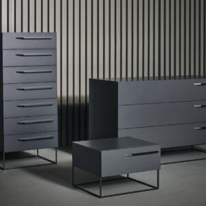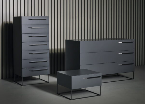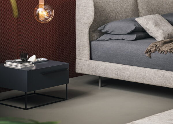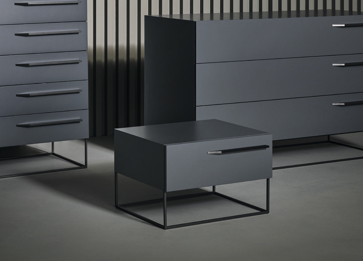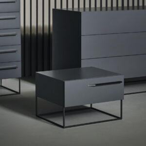 Beautifully finished, the To Be bedside cabinet is part of a collection which also includes a chest of drawers and a tall chest of drawers, as well as a low bedside cabinet on a plinth rather than a metal frame – see related products.