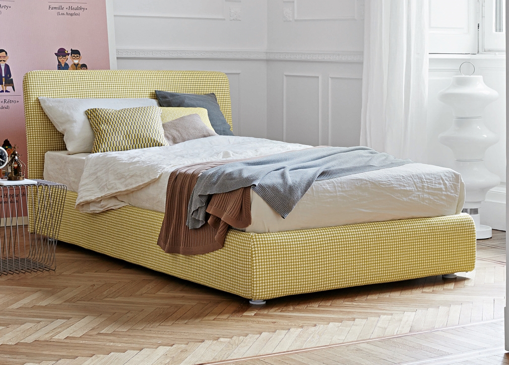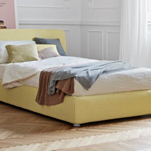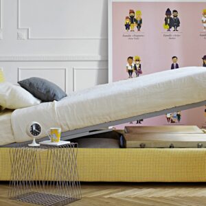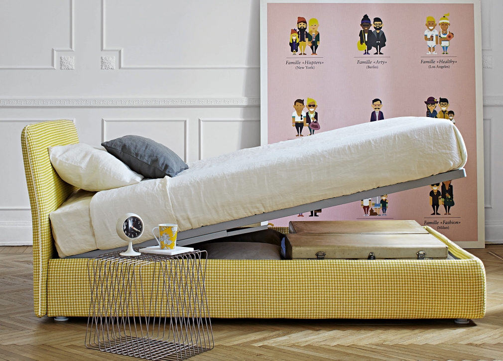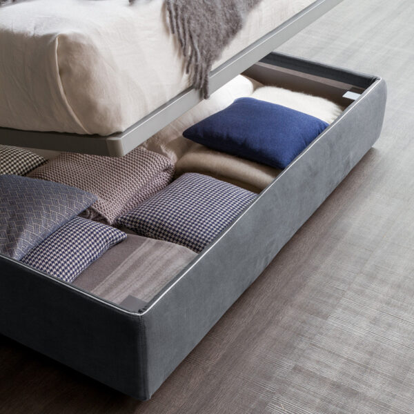 The Bonaldo Tonight storage bed uses hydraulic gas powered pistons to lift the mattress to provide a practical dust free storage space which can be accessed even when the bed is fully made up. This up to the minute simple contemporary upholstered bed features contrasting fabric piping along the padded headboard and around the base.