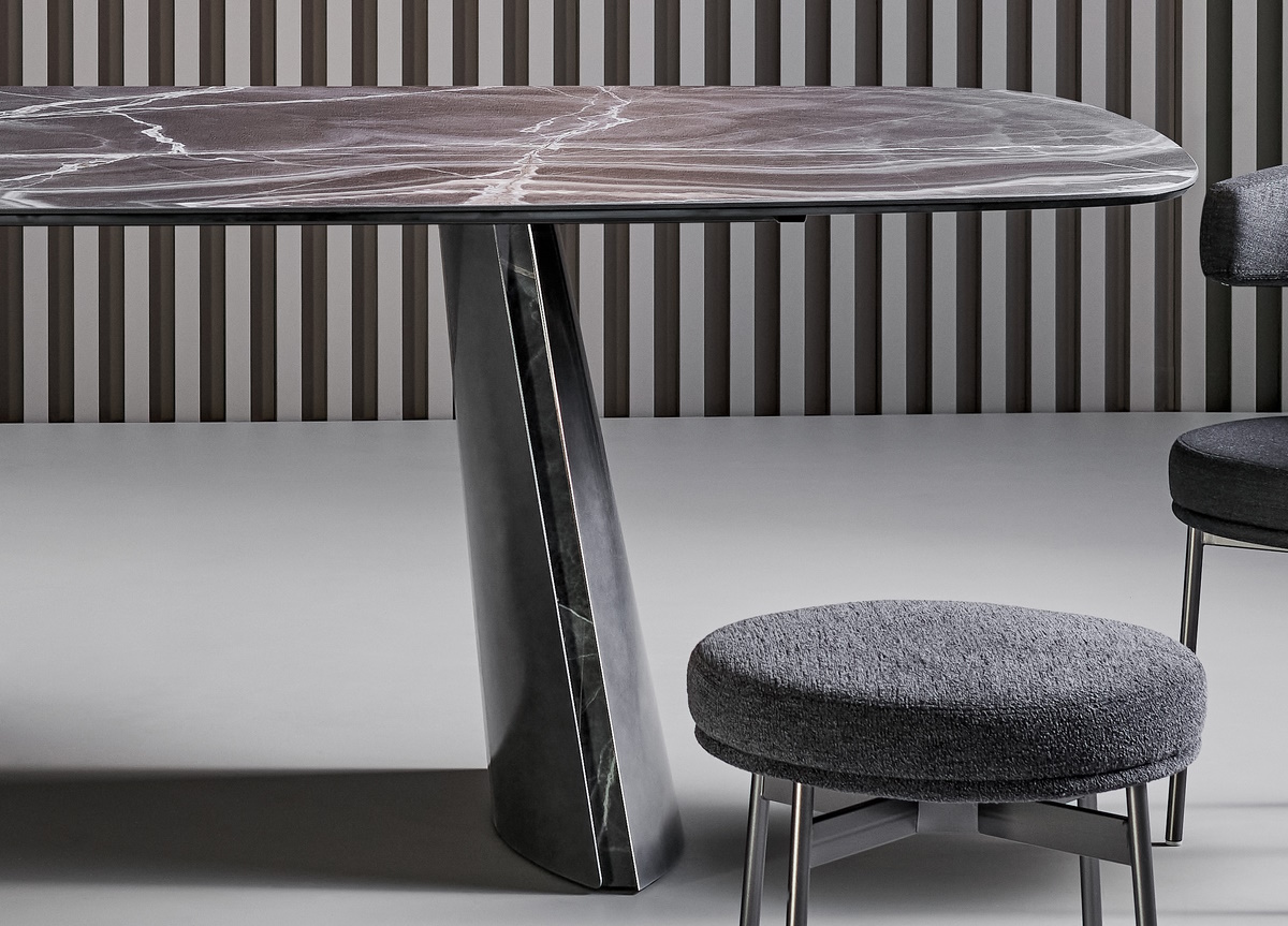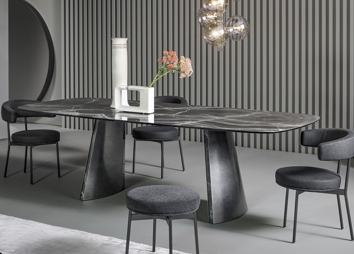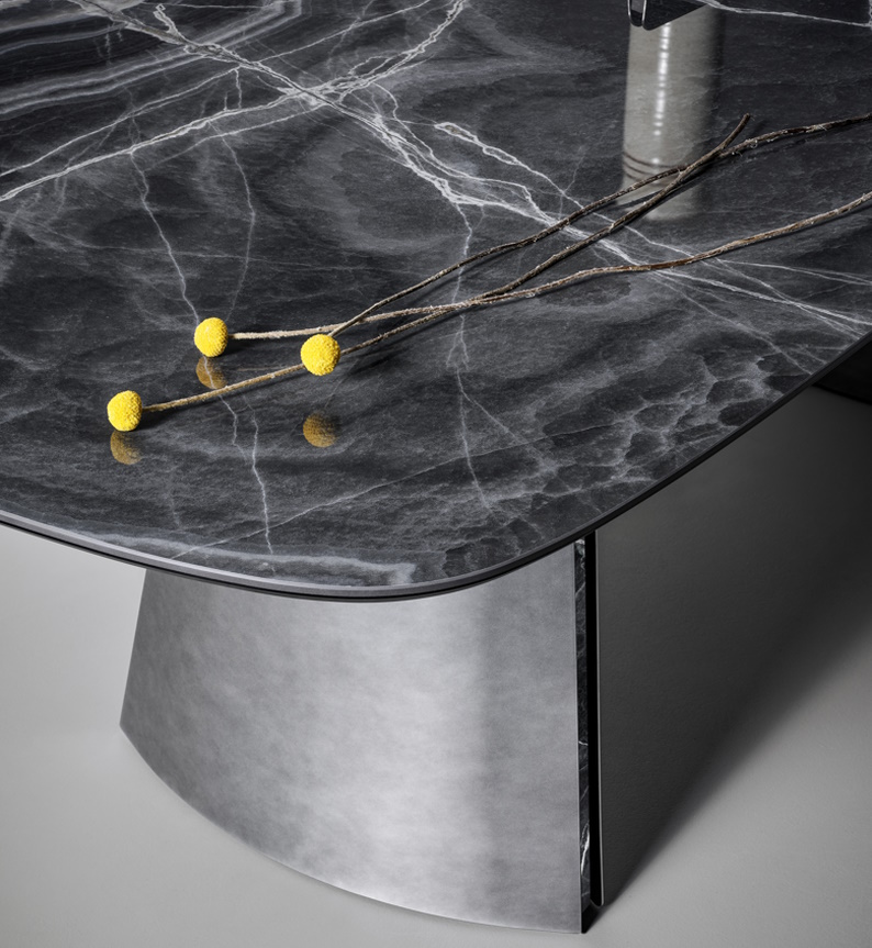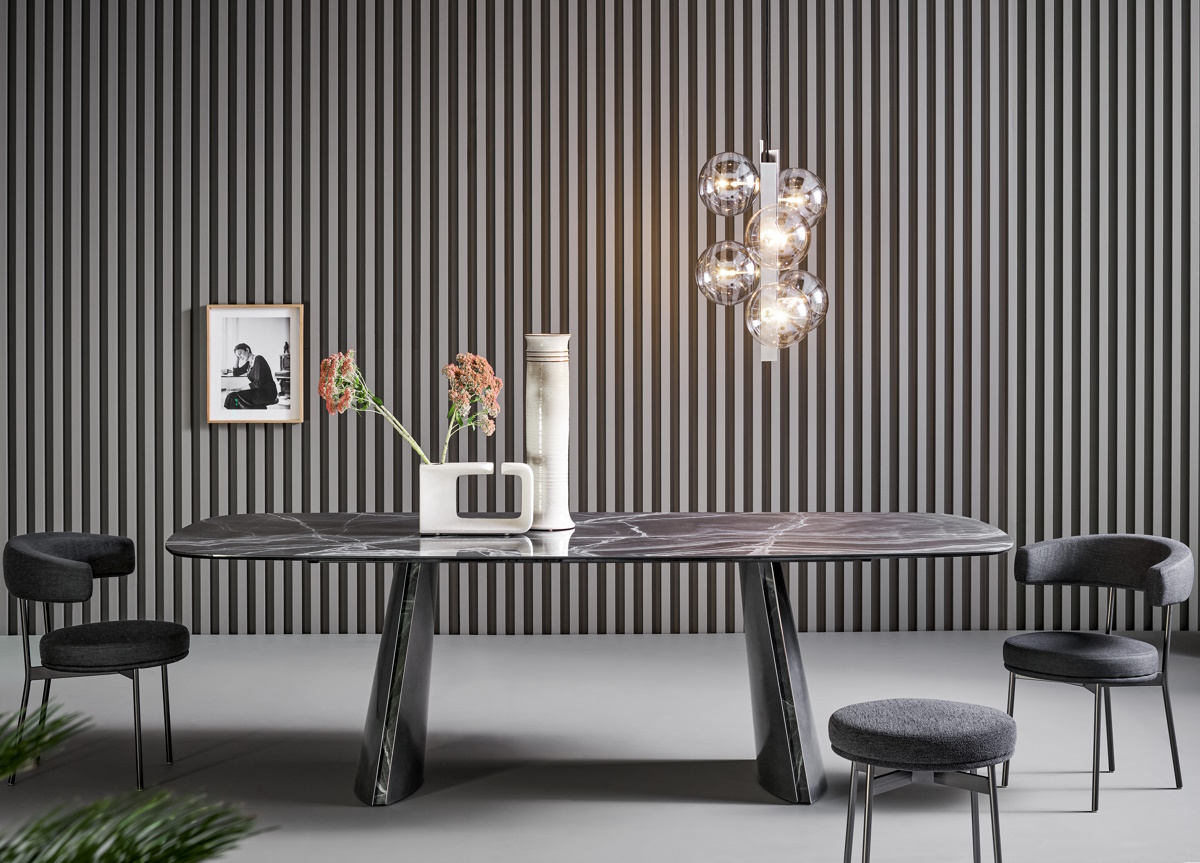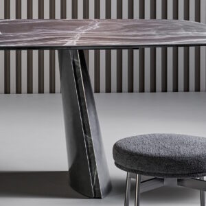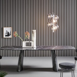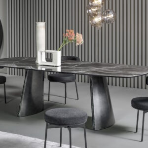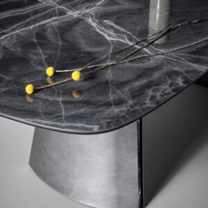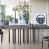 Pictured here with a table top and base inserts in Black Onyx ceramic with a clouded chrome base. The Torii dining table is matched with the Neuilly dining chairs, however, this beautiful table will also match any of Bonaldo’s other dining chairs.