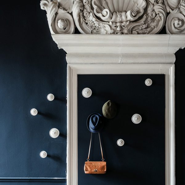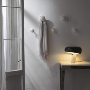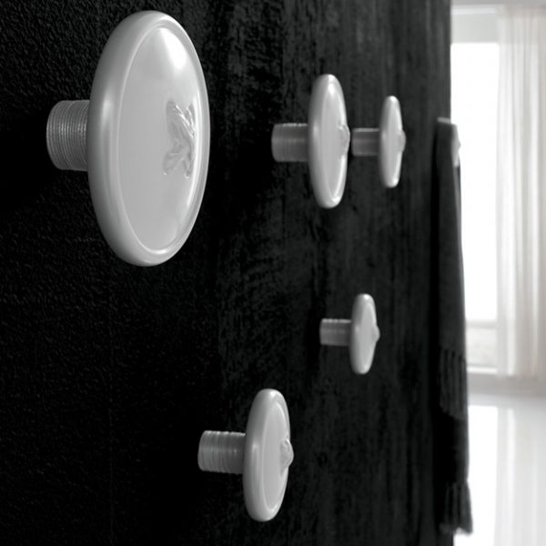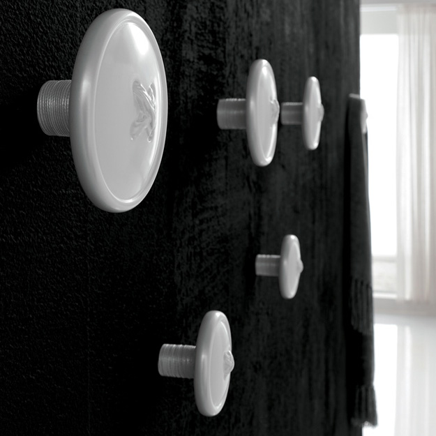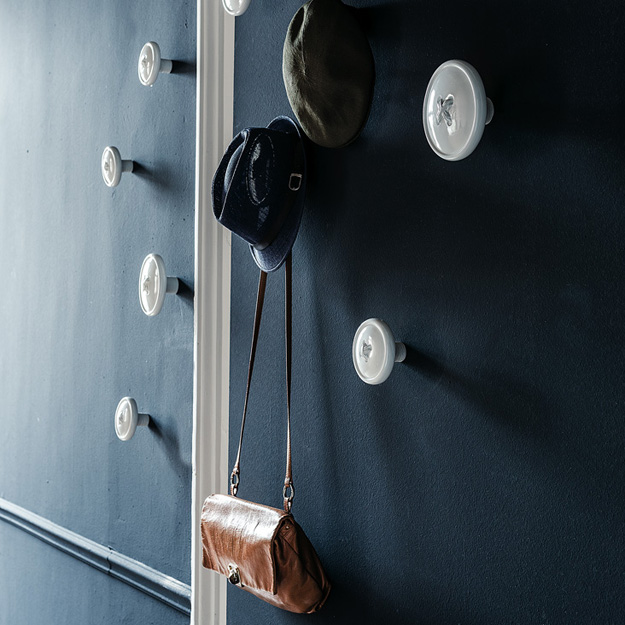 The Bottone coat hanger is a sleek circular design in Pearl White painted polyurethane featuring a detailed cross pattern in the centre. Available in two sizes, either individually or as a set of five small hooks; five medium hooks; five hooks consisting of three small and two medium; or five hooks consisting of two small and three medium.