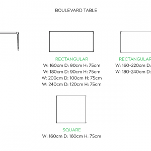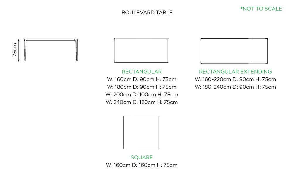 | Size | Rectangular – W: 160cm D: 90cm H: 75cm, Rectangular – W: 180cm D: 90cm H: 75cm, Rectangular – W: 200cm D: 100cm H: 75cm, Rectangular – W: 240cm D: 120cm H: 75cm, Rectangular Extending – W: 160cm-220cm D: 90cm H: 75cm, Rectangular Extending – W: 180cm-240cm D: 90cm H: 75cm, Square – W: 160cm D: 160cm H: 75cm |