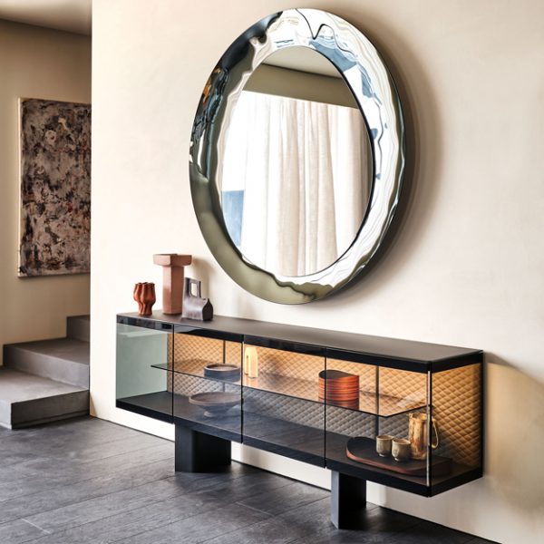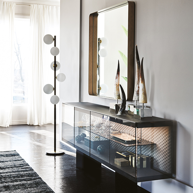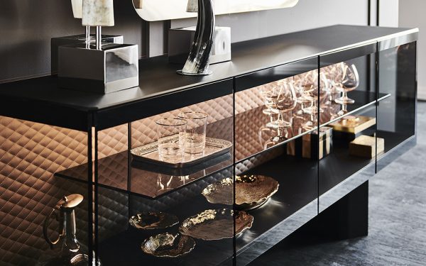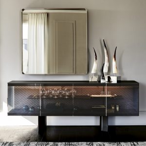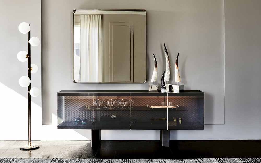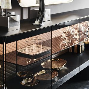 With an Art Deco style, the Boutique sideboard features smoked grey glass doors with black-painted stripes for added detailing. The frame and feet come in a black lacquered steel finish, while the top and bottom come in a black-painted frosted glass finish.