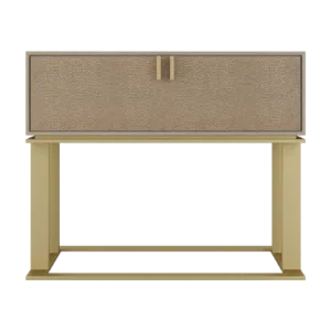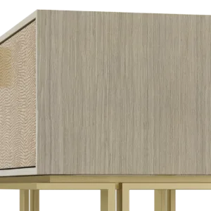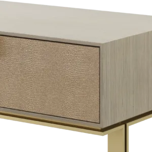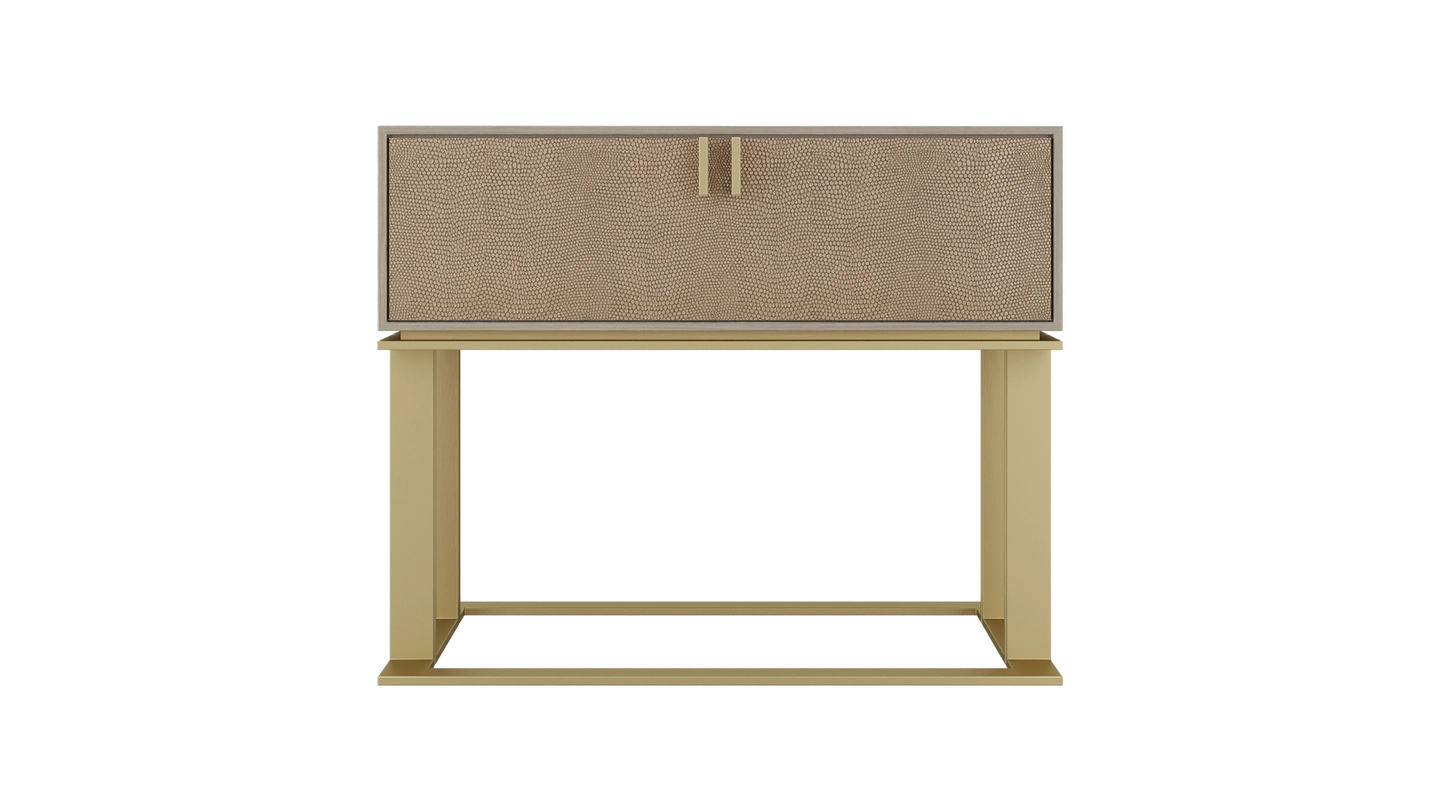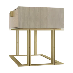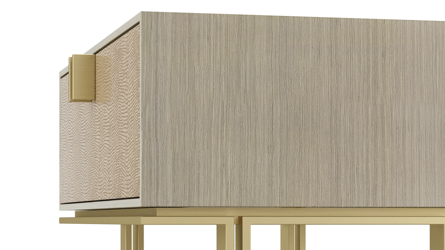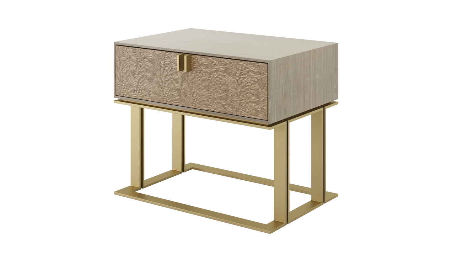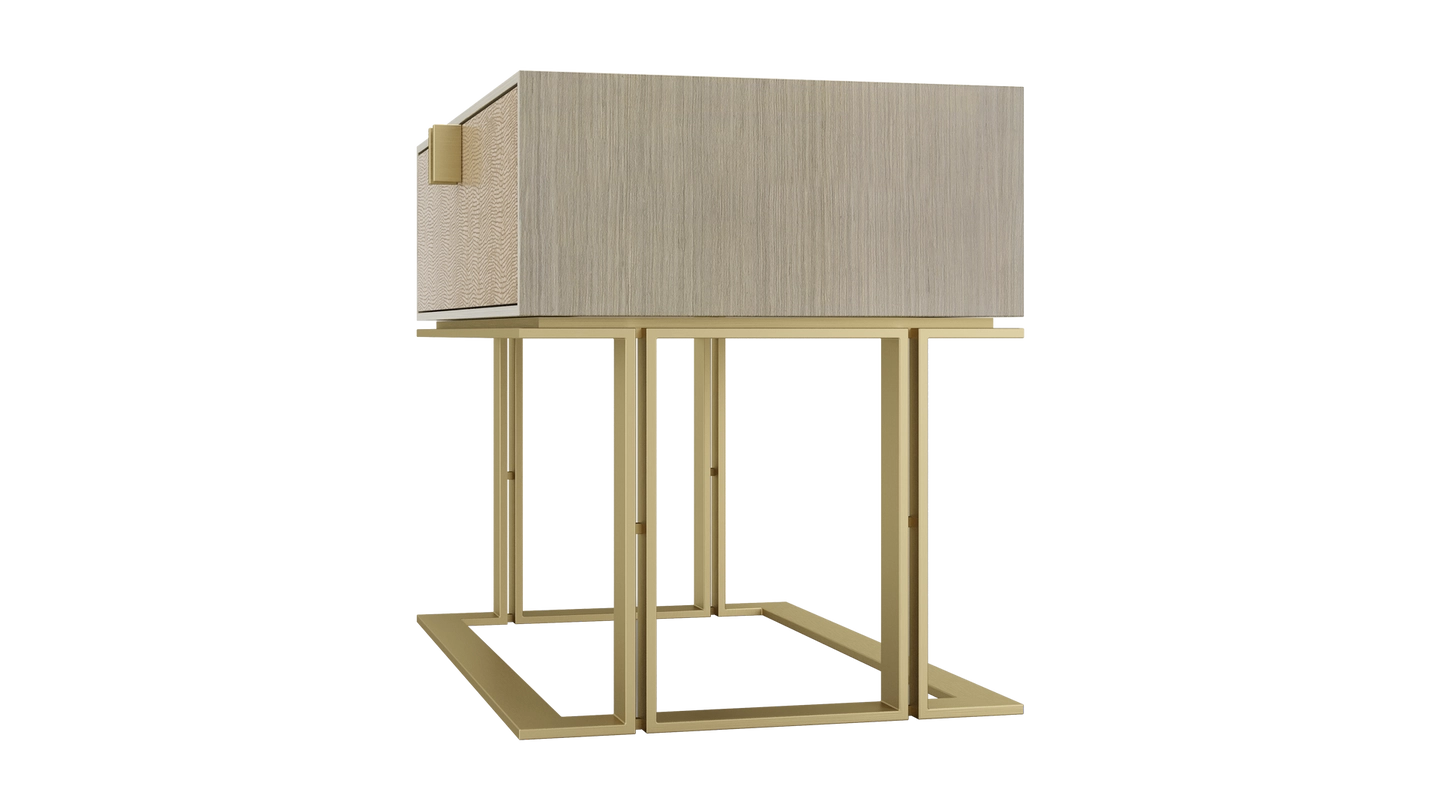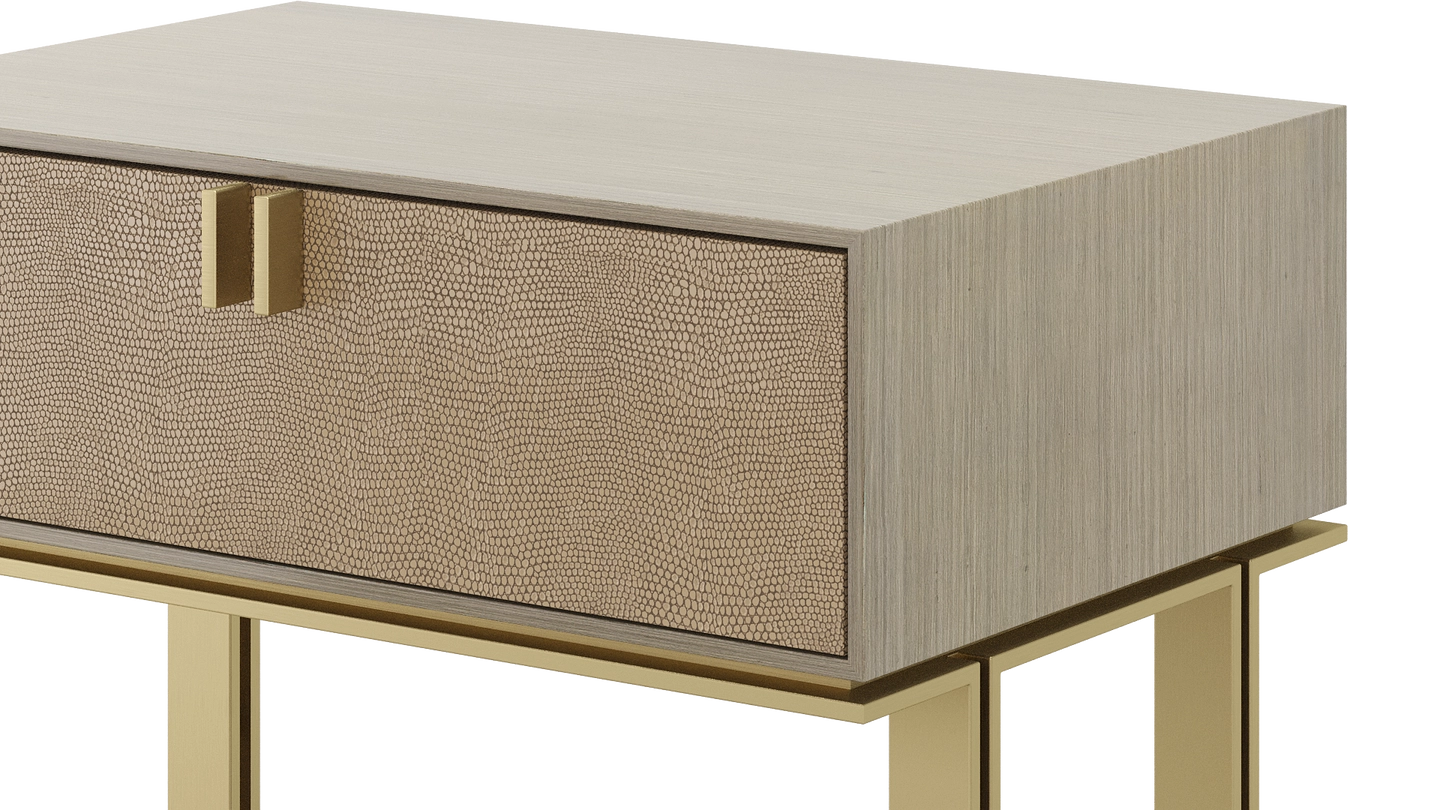 FRATO’s master craftsmen let loose their ingenuity when making the BRISBANE bedside table. Comprised of a glossy veneer box with a leather-fronted, suede-lined drawer, this portion of the design appears to hover above a sculptural base skilfully constructed from four sections of brushed brass.