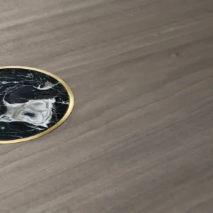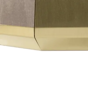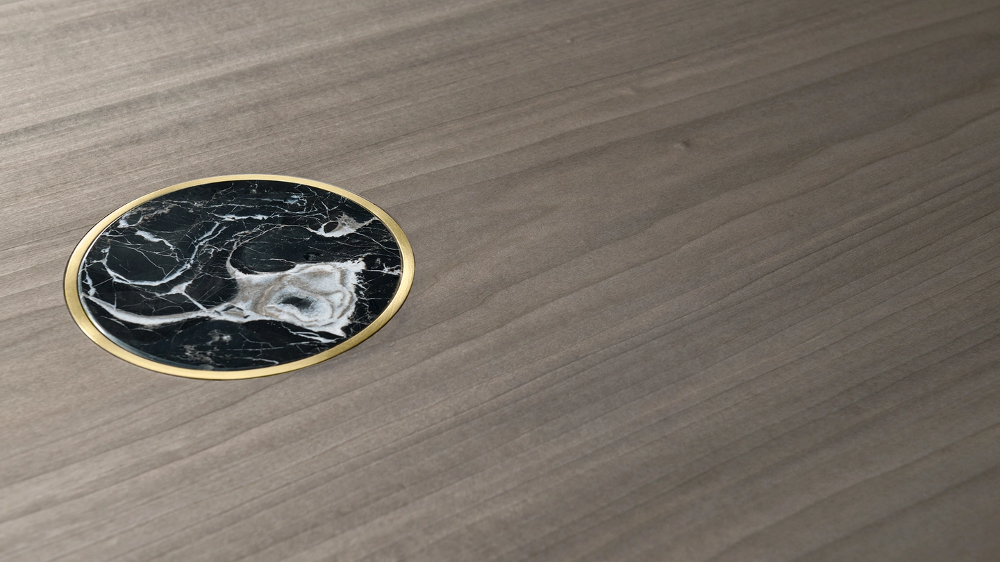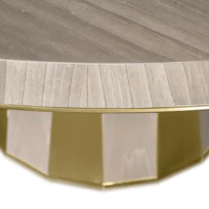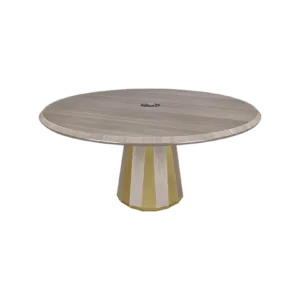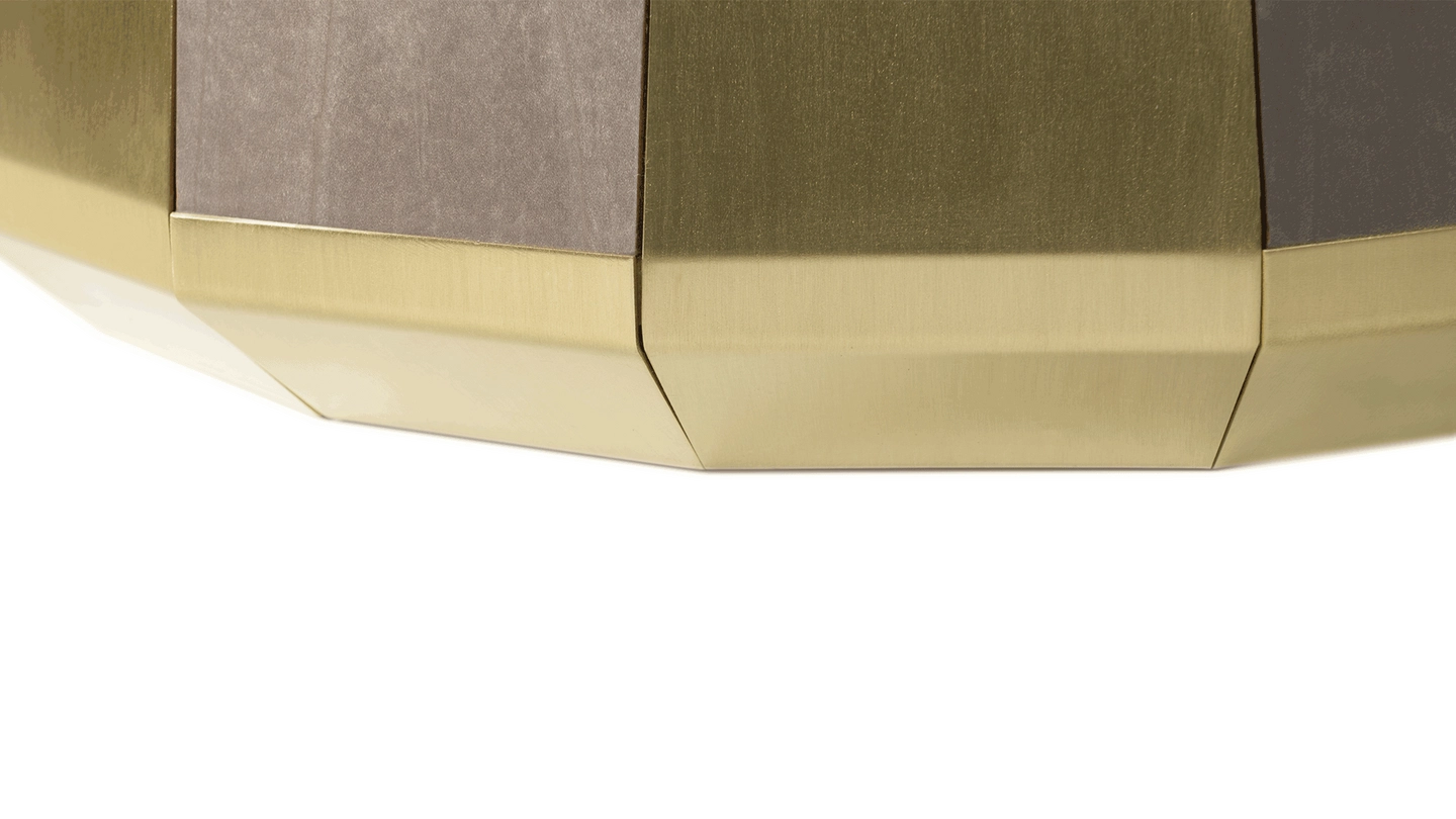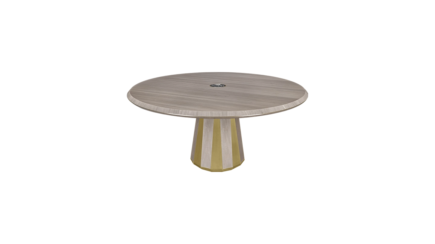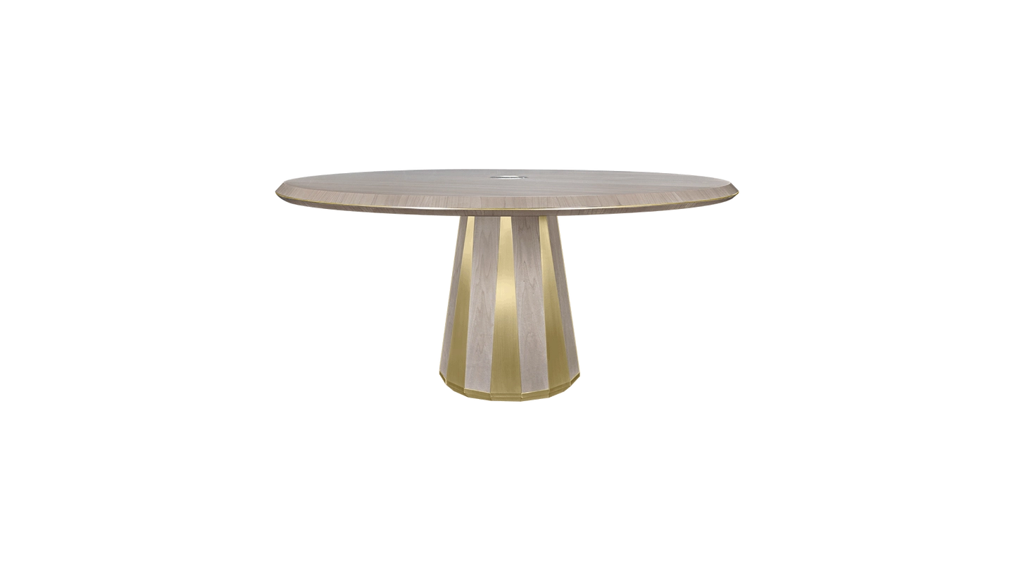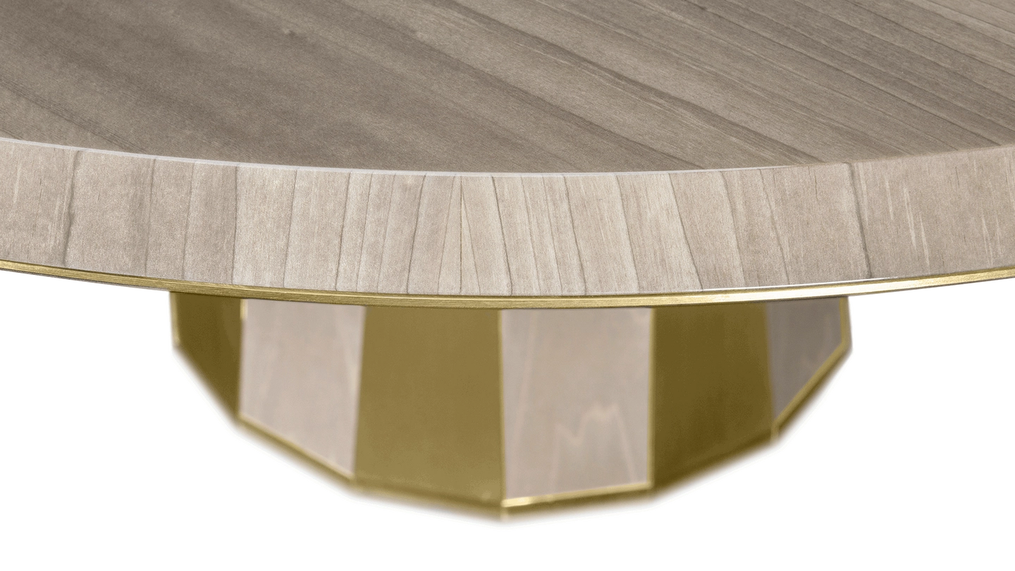 Alternating sections of contrasting brushed brass and grey lacquered wood transform the pedestal of the circular BRUGES dining table into something extraordinary.