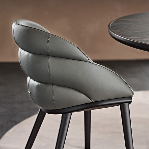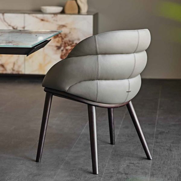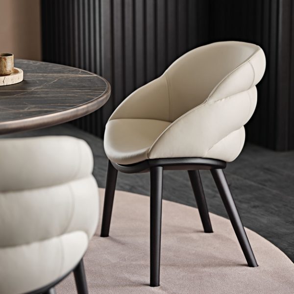 The distinctive Camilla Chair with Wood Legs is characterised by its curvaceous padded seat and backrest. Detailed seams that run horizontally along the back of the backrest create three voluminous sections that disappear fluidly into the sloping armrests.