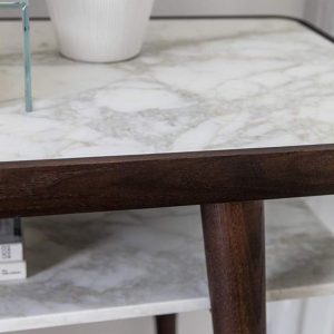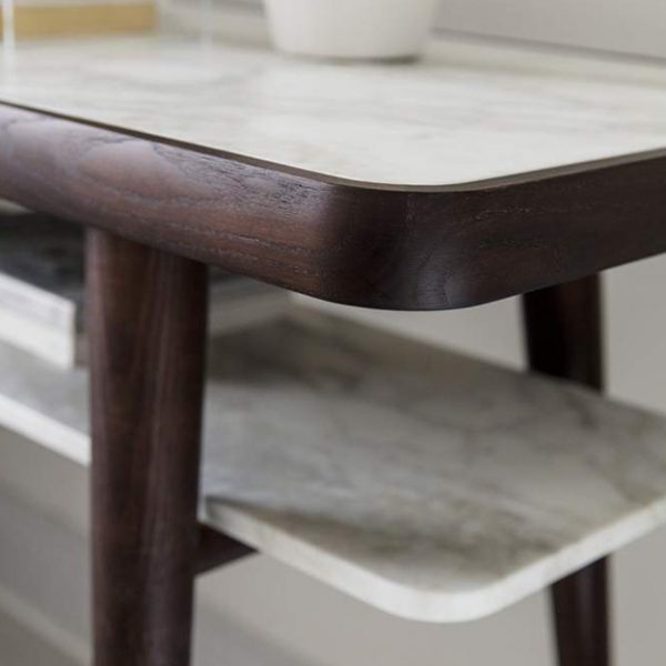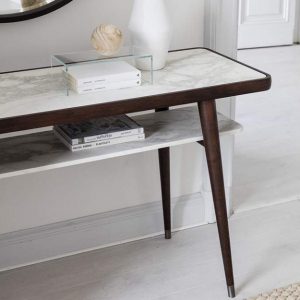 The Chantal Console table features a solid Ash Wood frame and a stylish Marble or Glass top with matching shelf that sits just below the top. Available in various finishes with Anthracite brushed metal feet for a sleek finish.