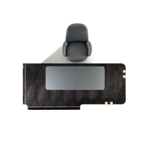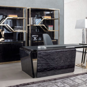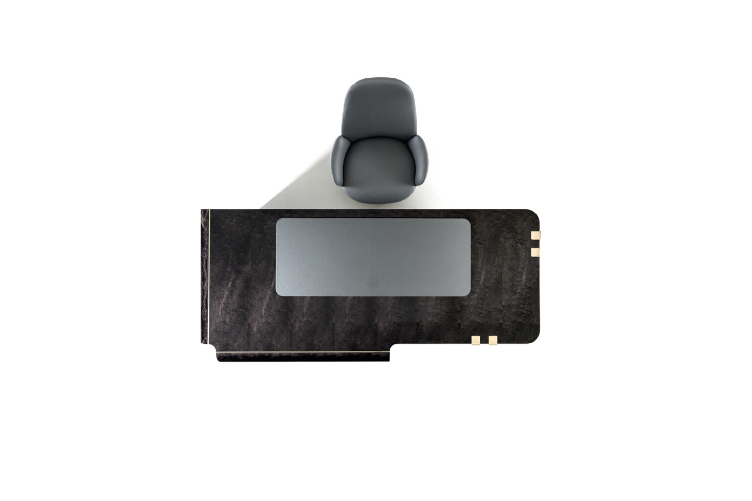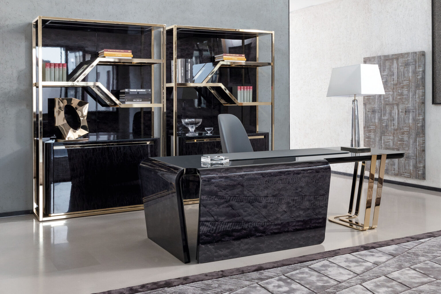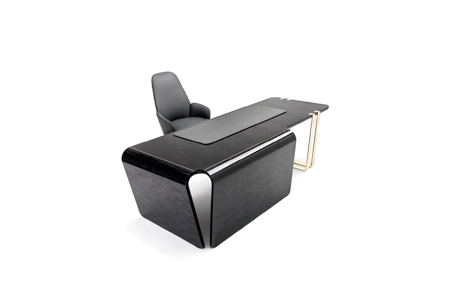 Desk in Black Bubinga burl veneer with high gloss polyester finish. Top insert in grey leather. Legs and details in light gold chrome stainless steel with Giorgio Collection logo.