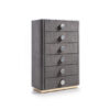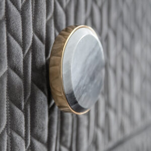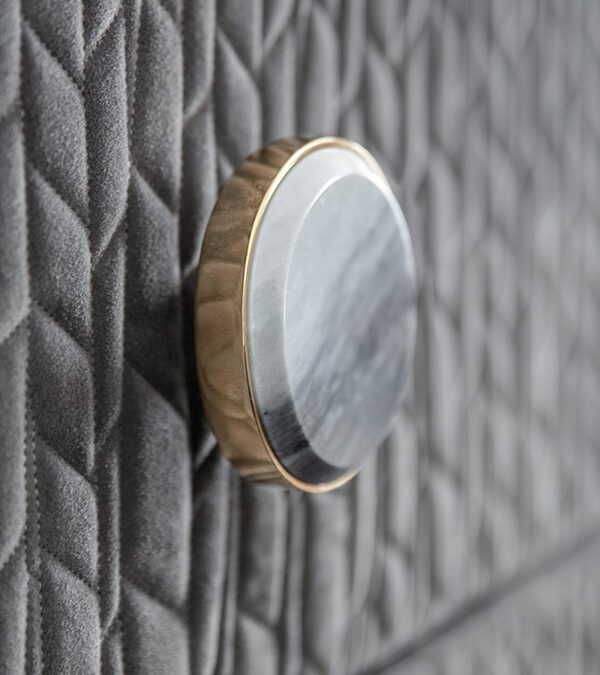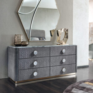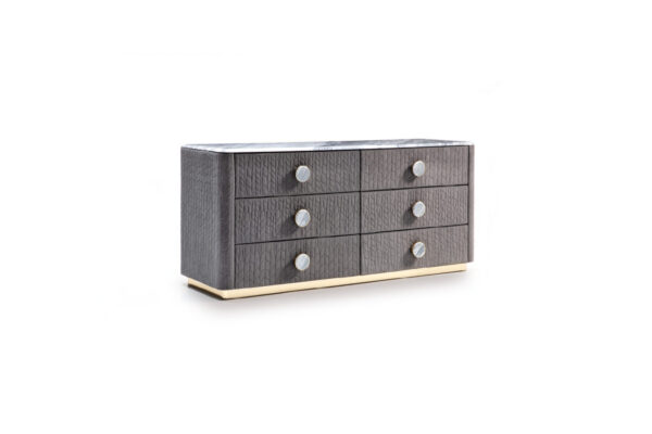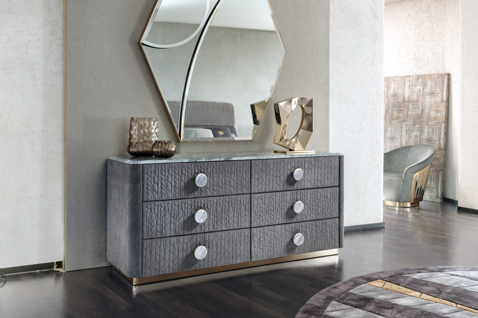 Dresser in quilted grey nubuk color nr 6 with top in beveled marble. Base in light gold chrome stainless steel. 6 big center handles in combination with gold chrome stainless steel and beveled marble. 6 full extension drawers with bottom part in velvet fabric.
