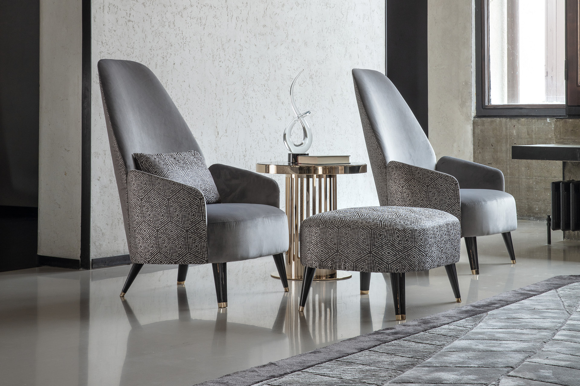 Ottoman for occasional chair. Base details in light gold chrome stainless steel.
