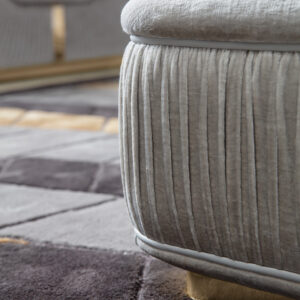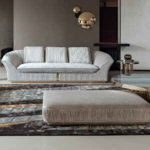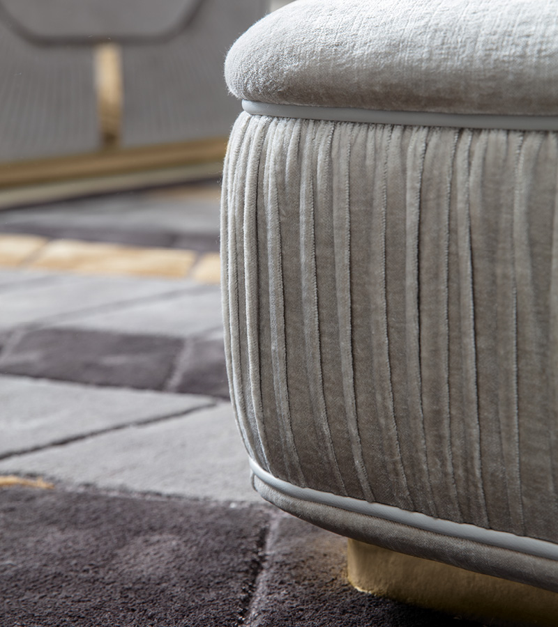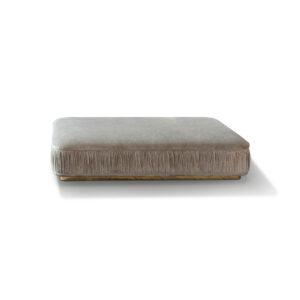 Ottoman/cocktail table with quilted side parts available in first grade leather, nubuk leather, lizard printed leather, velvet or suede fabric. Seat in polyurethane foam wrapped in down feather. Base in light gold chrome stainless steel.