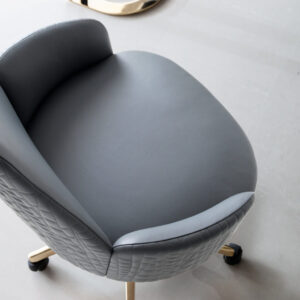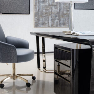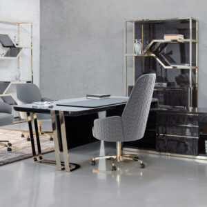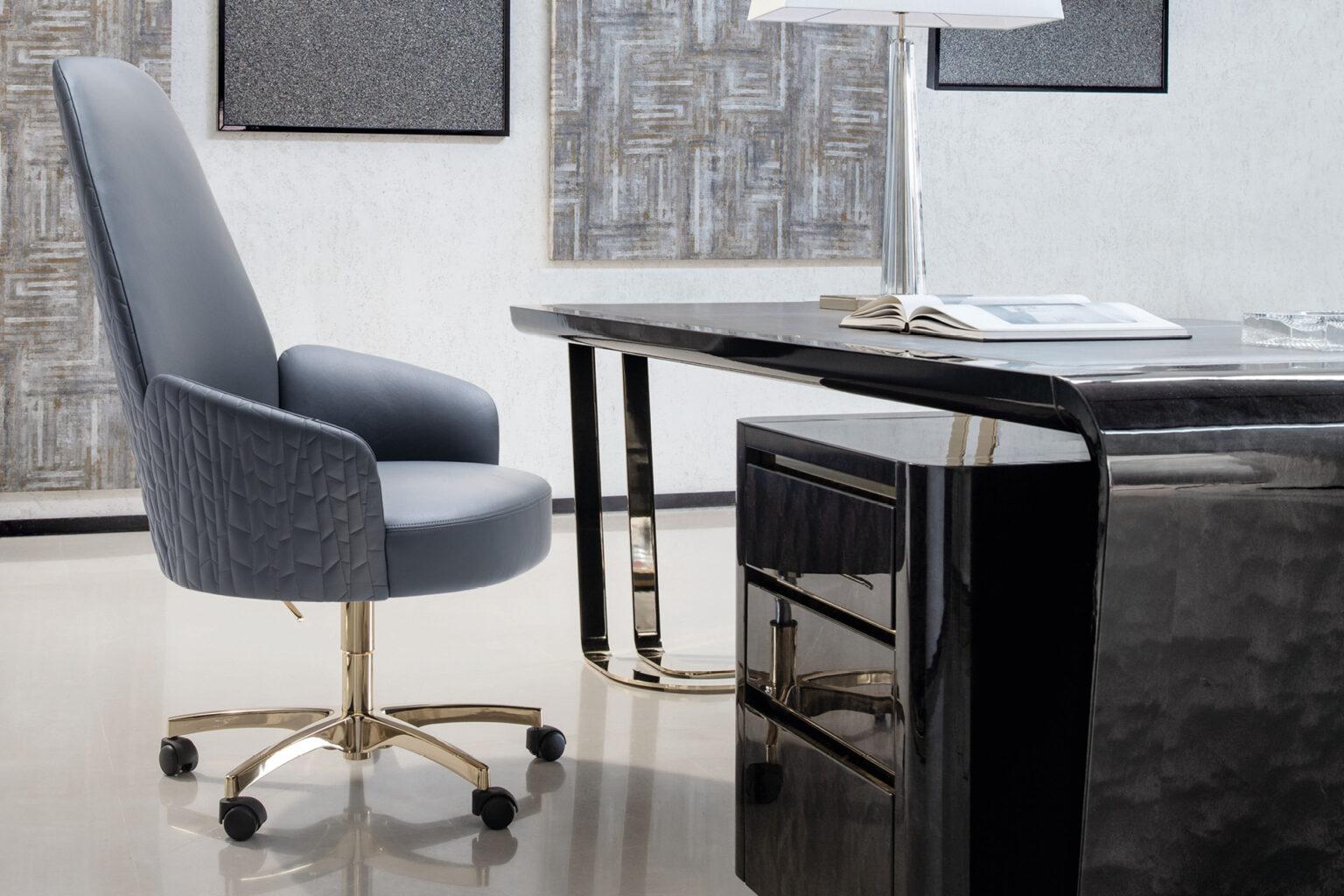 Presidential office chair available in leather, nubuk, leather, suede fabric, on wheels with adjustable height. Quilted back. Base in light gold chrome stainless steel.