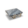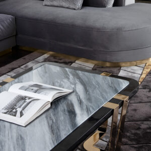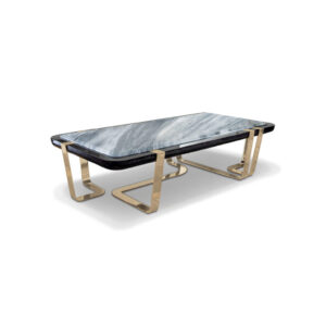 Rectangular cocktail table with frames in Black Bubinga burl veneer with high gloss polyester finish and light gold chrome stainless steel. Top in beveled marble.