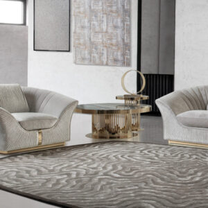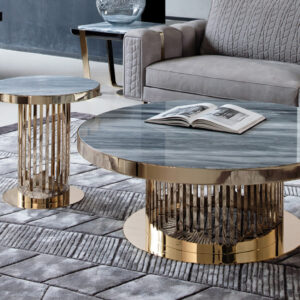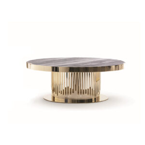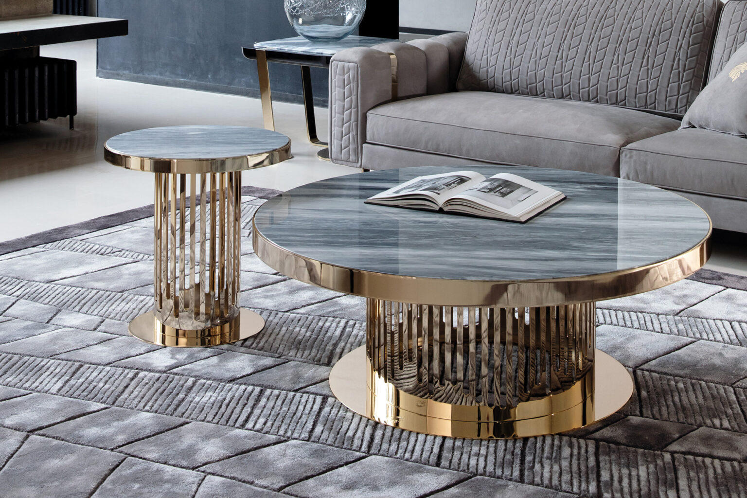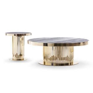 Round end table in 24k gold chrome stainless steel.Giorgio Collection logo on the metal base.