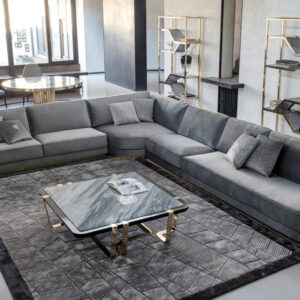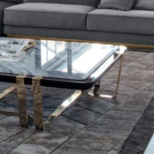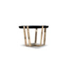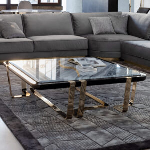 Square cocktail table with frames in Black Bubinga burl veneer with high gloss polyester finish and light gold chrome stainless steel. Top in beveled marble