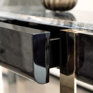 Vanity desk in Black Bubinga burl veneer with high gloss polyester finish. Top in beveled marble. Legs in light gold chrome stainless steel with Giorgio Collection logo.