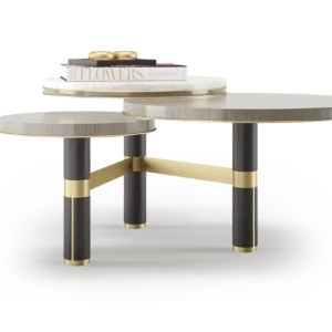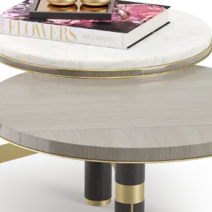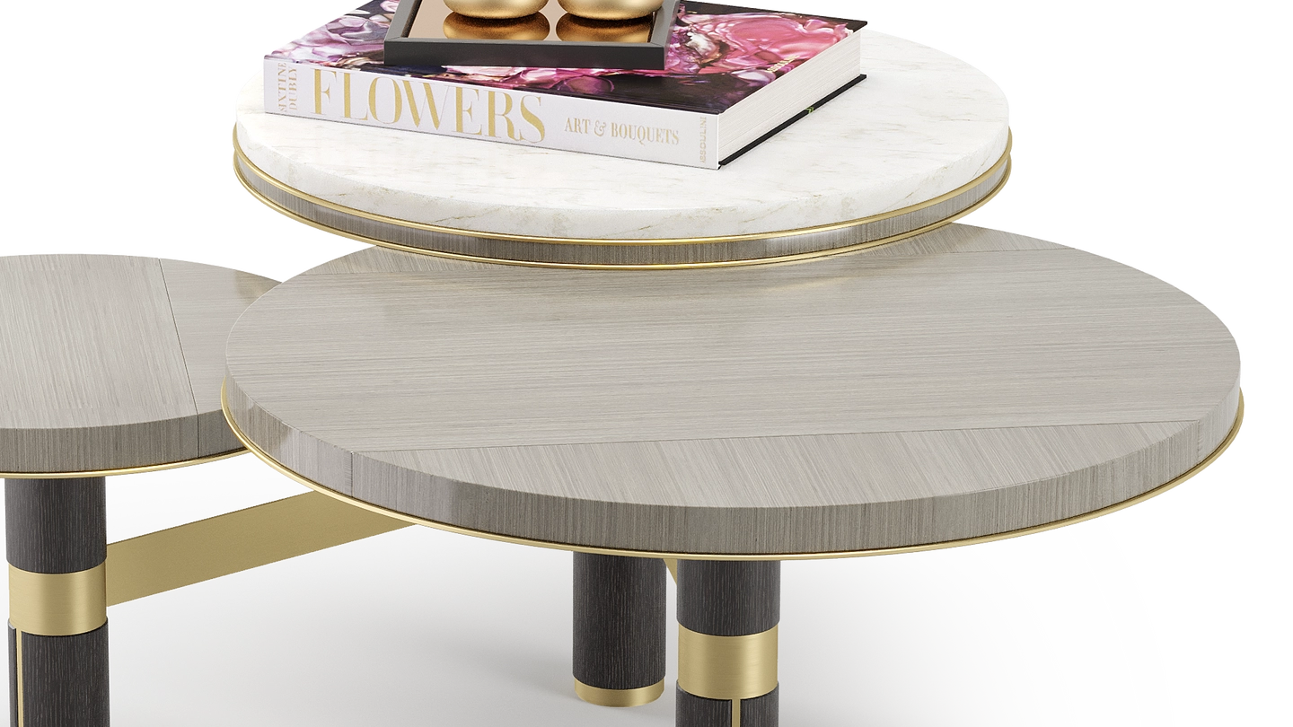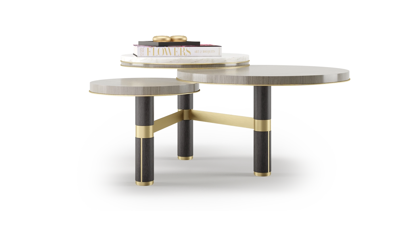 Featuring a medley of different materials (stone, glossy veneer, solid wood, brushed brass) and a trio of overlapping surfaces, the striking CHARLESTON coffee table will bring a jazz-like rhythm to any space. Position where its intricate form can be fully admired.