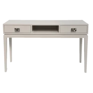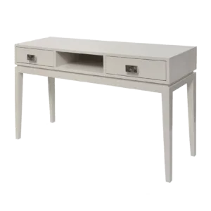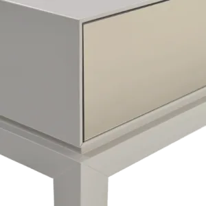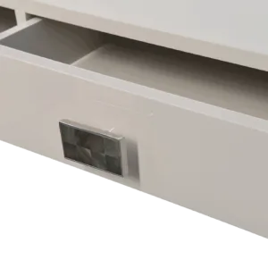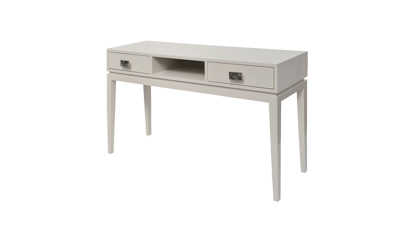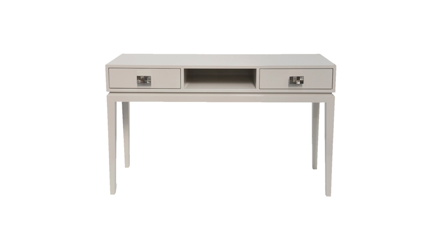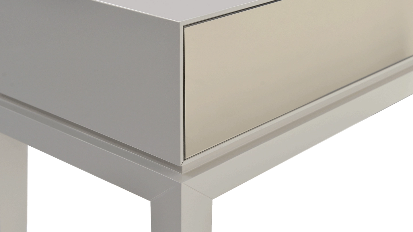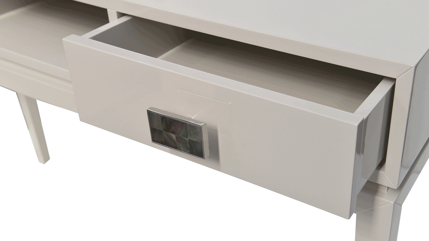 Seamlessly crafted from lacquered wood, the classically proportioned CHICAGO console embodies pure elegance. Featuring two drawers with black mother-of-pearl handles and an open shelf, the design includes a hidden detail: a panel of bronze mirror across the back.