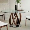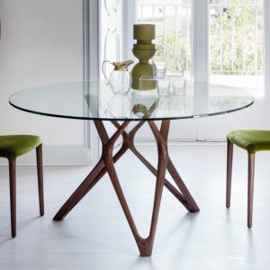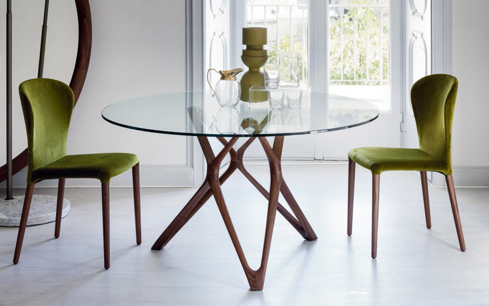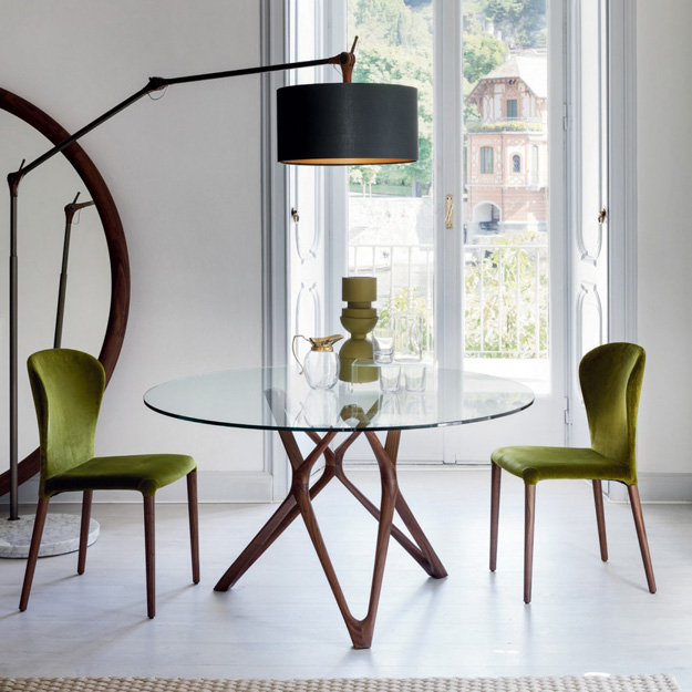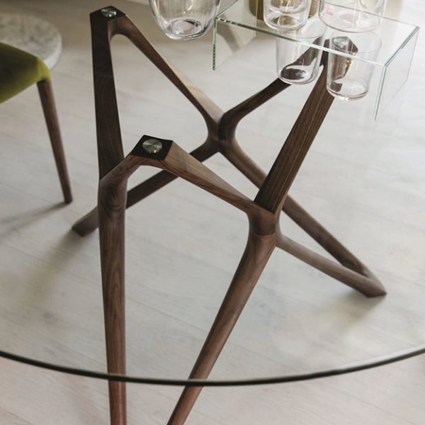 The Circe round dining table features an exquisite angular-shaped Canaletto Walnut base complemented with a classic round top. The circular top is available in a range of sizes and a variety of glass or Canaletto Walnut finishes.