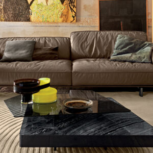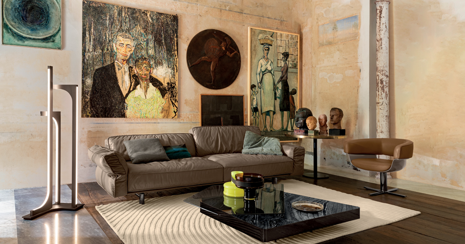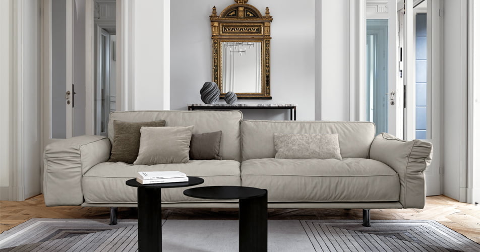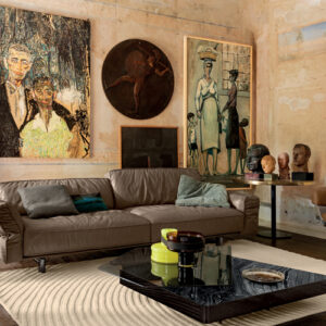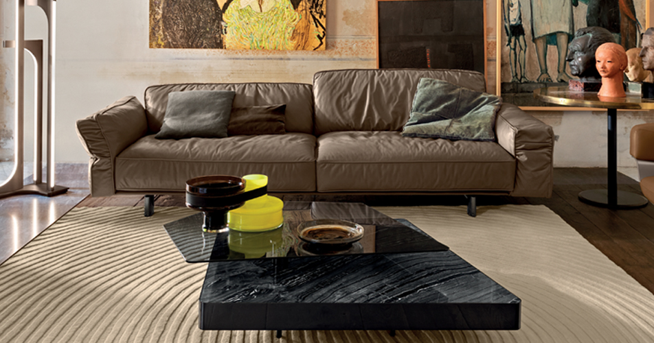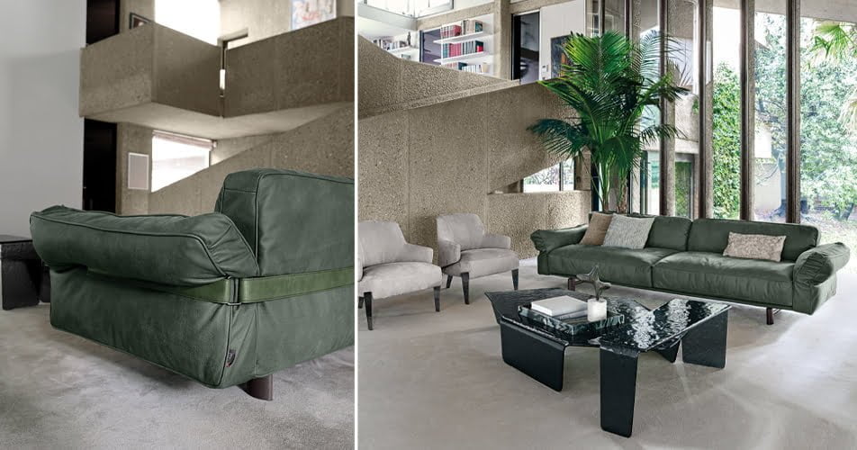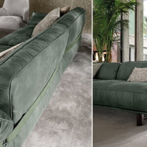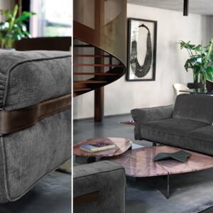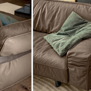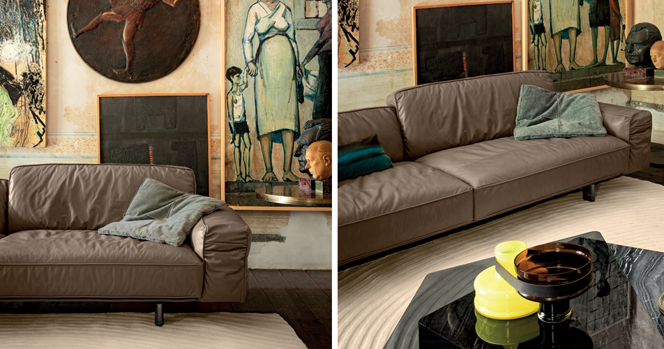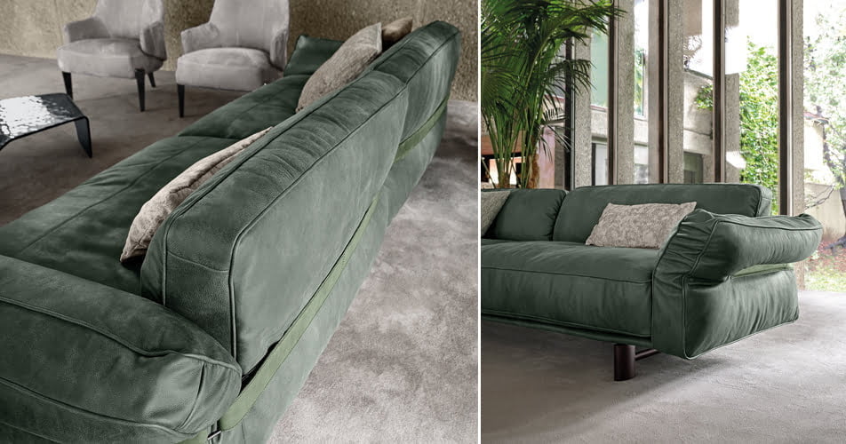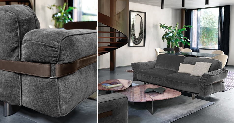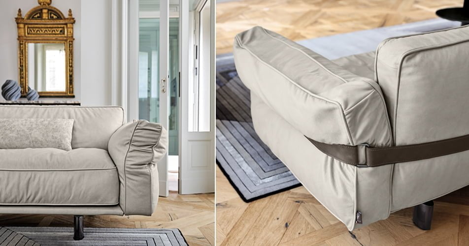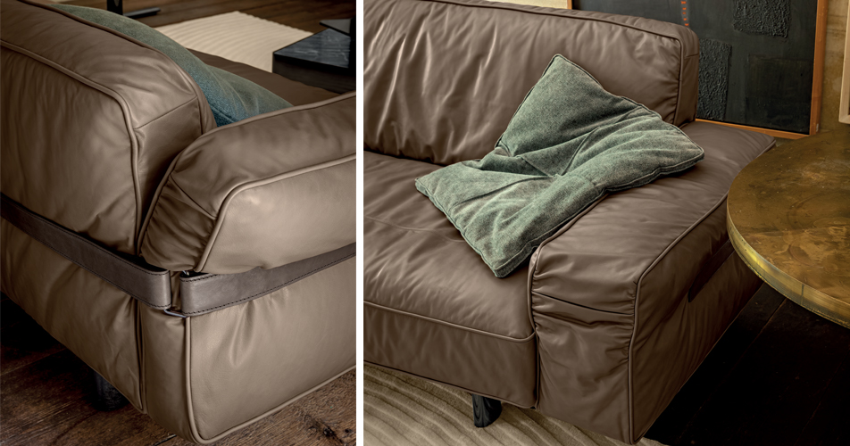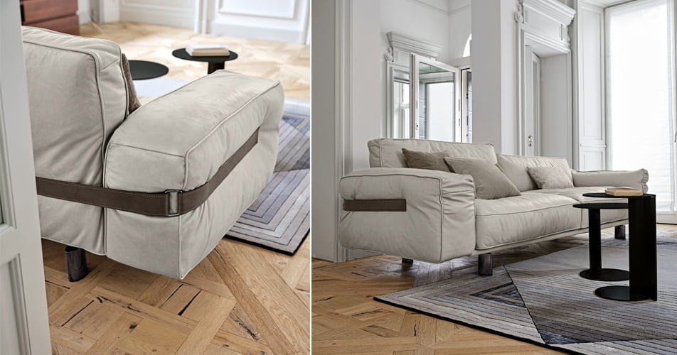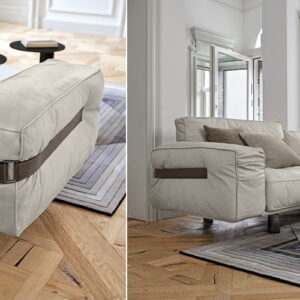 The elliptical feet of the sofa serve not only their natural function but are also uniquely expressive sculptural details. The wraparound belt provides a visual and physical embrace that brings together the supple back and armrest cushions in an intimate gesture. The belt’s assiduously fashioned leather straps and metal clasps epitomize the quality of the exclusive finishes that enhance the charm of the collection.