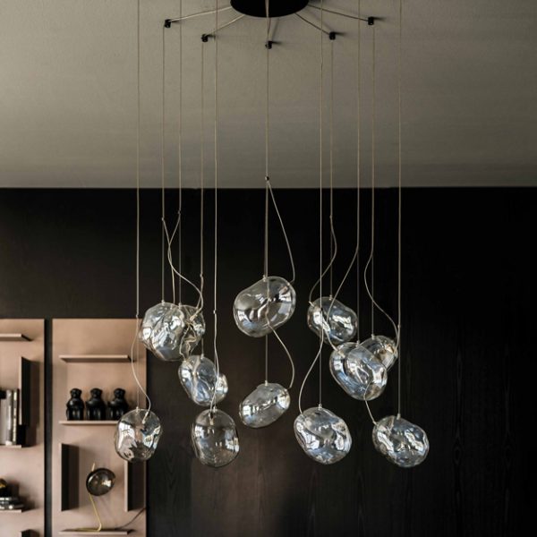 Cloudine is an intricate suspension light, featuring the option of Iride Glass or Fume Smoke Glass finish diffusers. This creative and elegant design is available as a single light, a cluster of six, or a cluster of twelve pendants all with a circular black chrome ceiling rose.