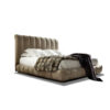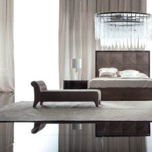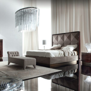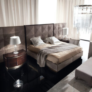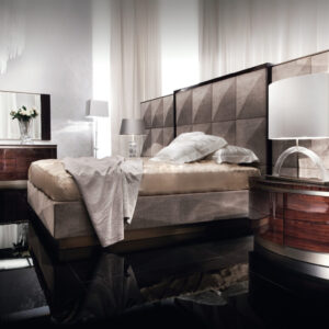 Upholstered bed with frames in Brazilian rosewood veneer with high gloss polyester finish. Available in first grade leather, nabuk leather, velvet, velour or suede fabric. Bronzed stainless steel base