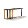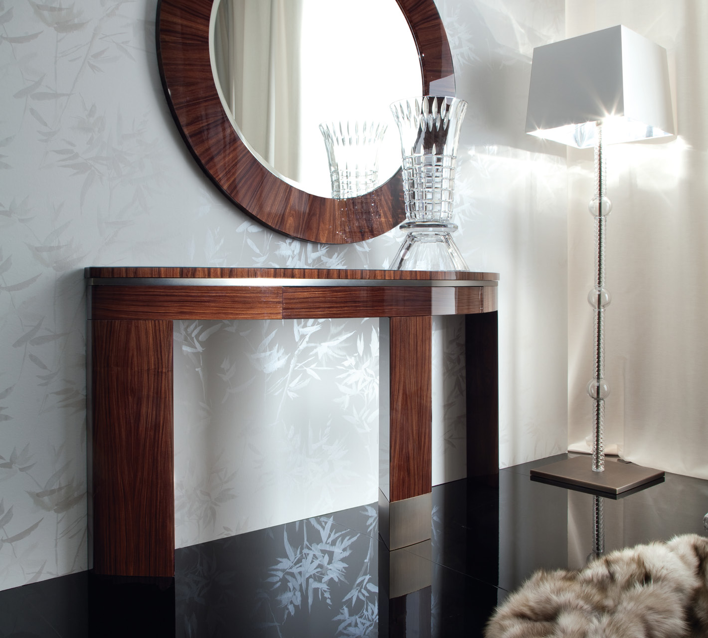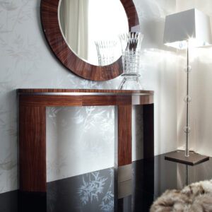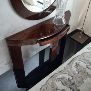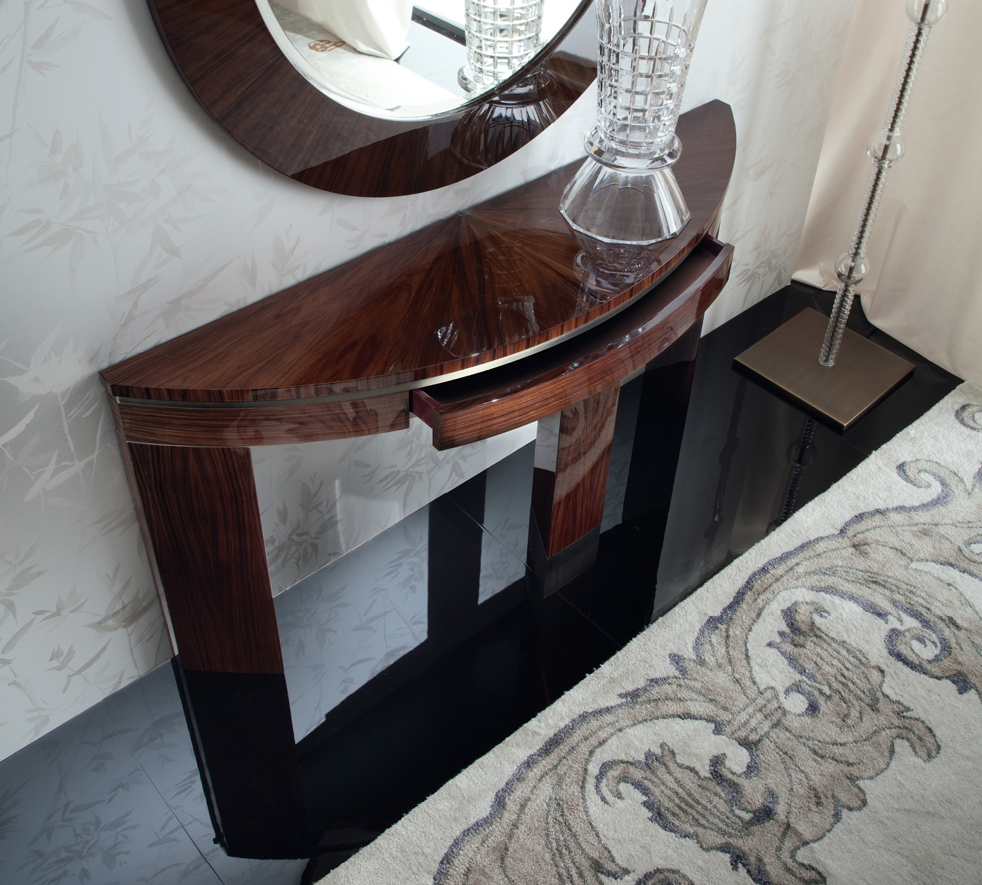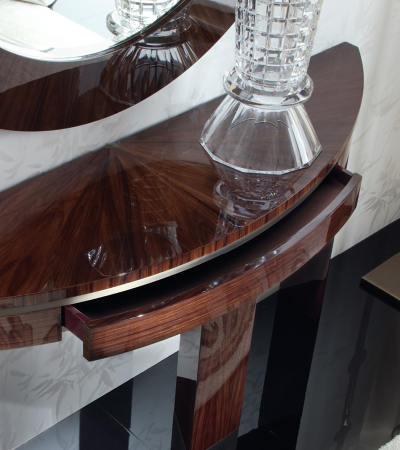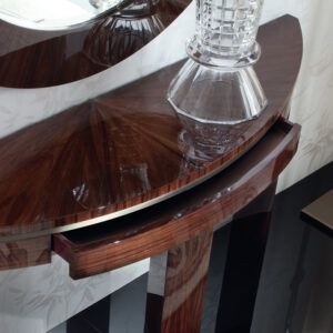 Consolle with combination of brazilian rosewood veneer with high gloss polyester finish and bronzed stainless steel details. Sunbursted veneer top. 1 full extension drawer w/bottom in velvet fabric.