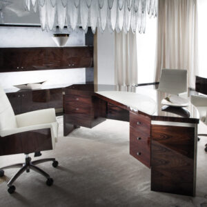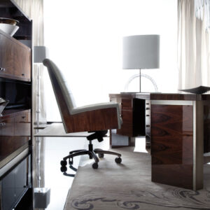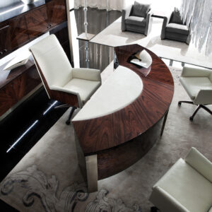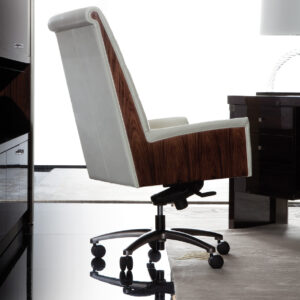 Presidential office chair in leather, nubuk leather, suede fabric, on wheels with adjustable height. Side panels in Brazilian rosewood veneer with high gloss polyester fi nish. Base in bronzed stainless steel. Leather needs: mt. 5,50 Nubuk leather needs: mt. 7,00 Fabric needs: mt. 3,00