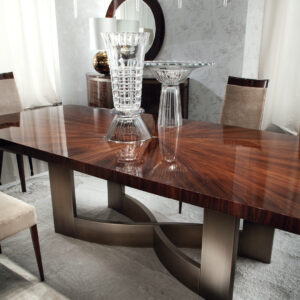 Rectangular table in brazilian rosewood veneer with high gloss polyester finish. Fixed top with base in bronzed stainless steel. Sunbursted veneer top.