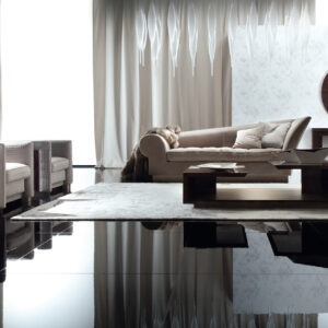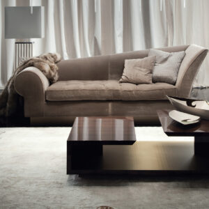 Sofa with n. 1 seat in polyurethane foam wrapped in down and n. 2 pillows . Bronzed stainless steel base.