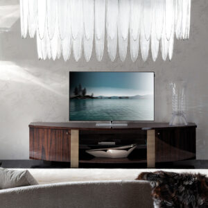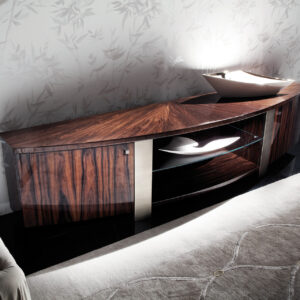 Base for plasma T.V. unit in Brazilian rosewood veneer with high gloss polyester fi nish. 2 doors and 1 open space. 1 center glass shelf and 2 lateral glass shelves Sunbursted veneer top with “Giorgio collection” inserted brass logo. Base, and handles in bronzed stainless steel.