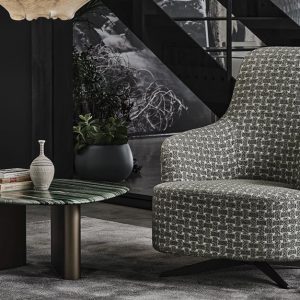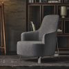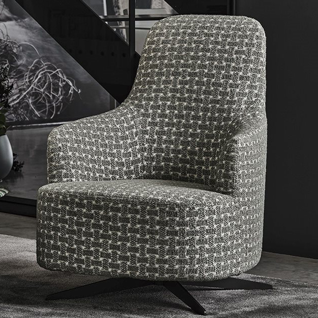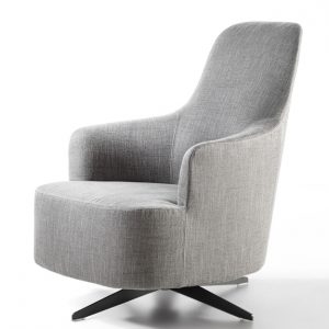 The Copine Bergere Swivel Armchair is an understated contemporary design with a high backrest that slopes smoothly to meet curved armrests and a welcoming rounded seat. This is complemented by a four-spoke metal swivel base with a returning mechanism, in a grey pewter finish.