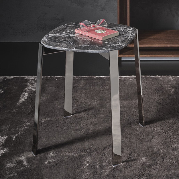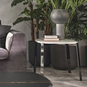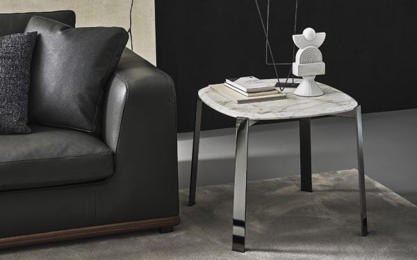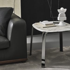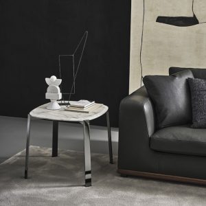 The Coquet Side Table is a sleek and minimal design featuring a rounded and bevelled square marble top on a stylish metal frame with flat-sided legs that rise to neatly meet the top’s edge.