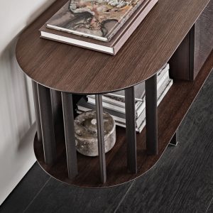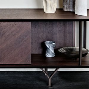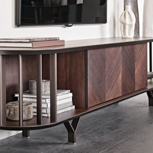 The Costes TV Unit is characterised by vertical bronze lacquered metal inserts at each end, giving it a unique look. This is paired with a classic wood frame in a choice of finishes and wood doors featuring diagonal inlays for interest.