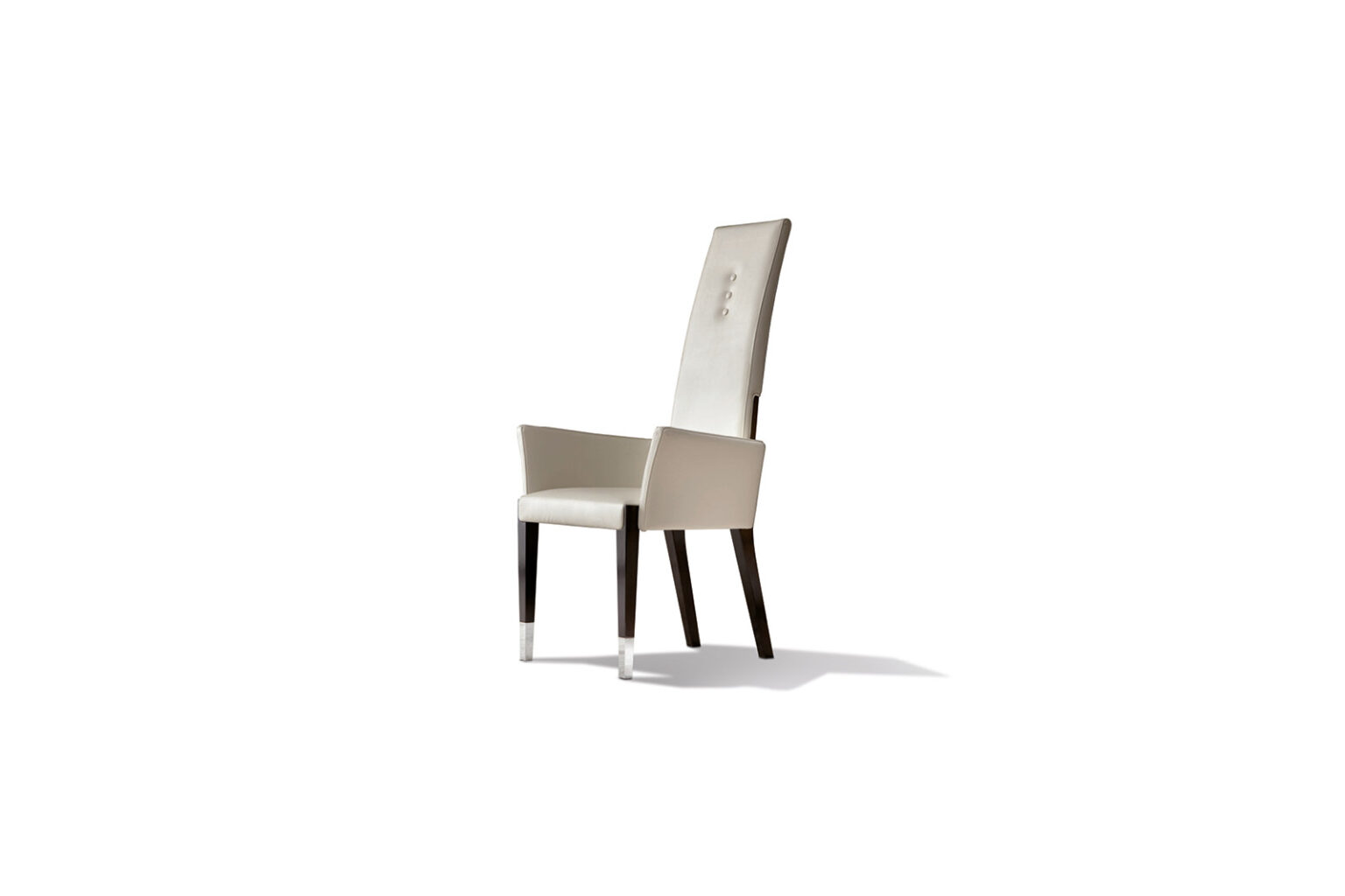 Armchair with solid beech wooden base and back and seat available in first grade leather, nubuk leather, lizard printed leather, velvet or suede fabric. 2 front legs with chrome stainless steel feet.