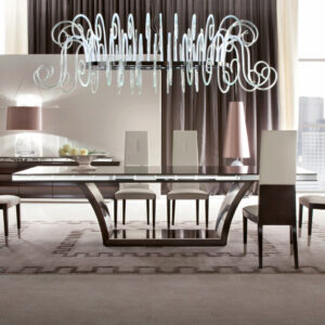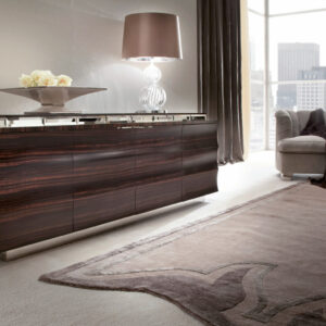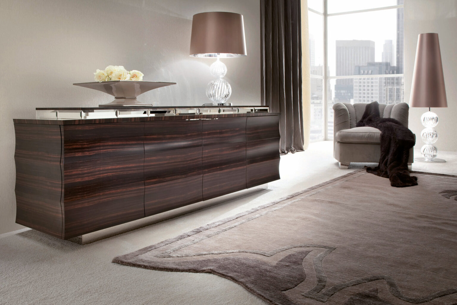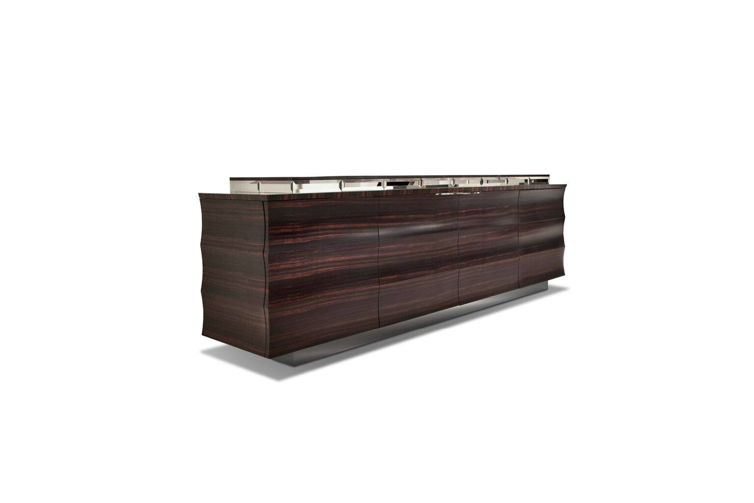 4 doors buffet in makassar ebony veneer in satin finish. Led Light system w/sensors in the 2 center doors. Top with insert on the edges in beveled mirrors and chrome stainless steel top inlay.