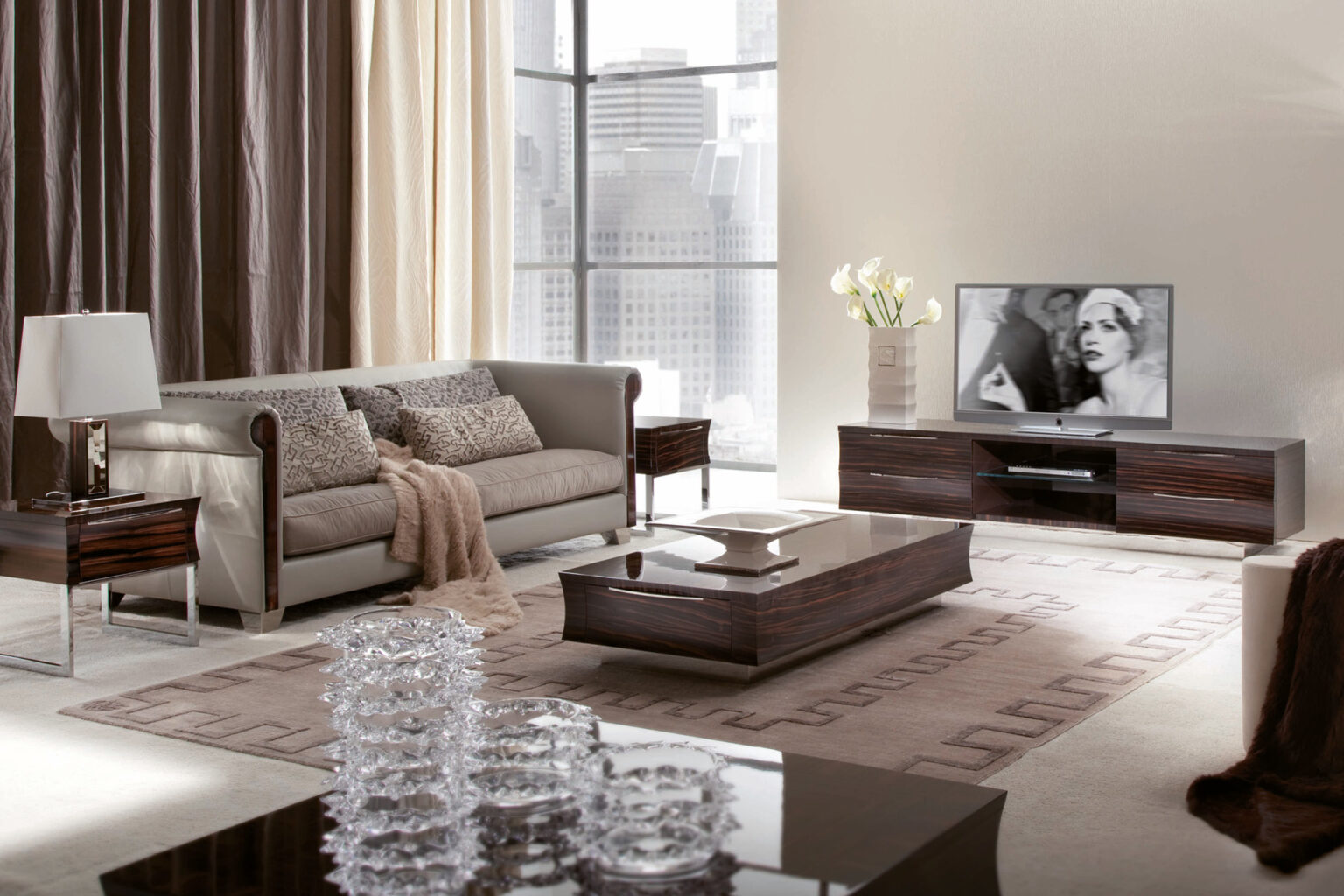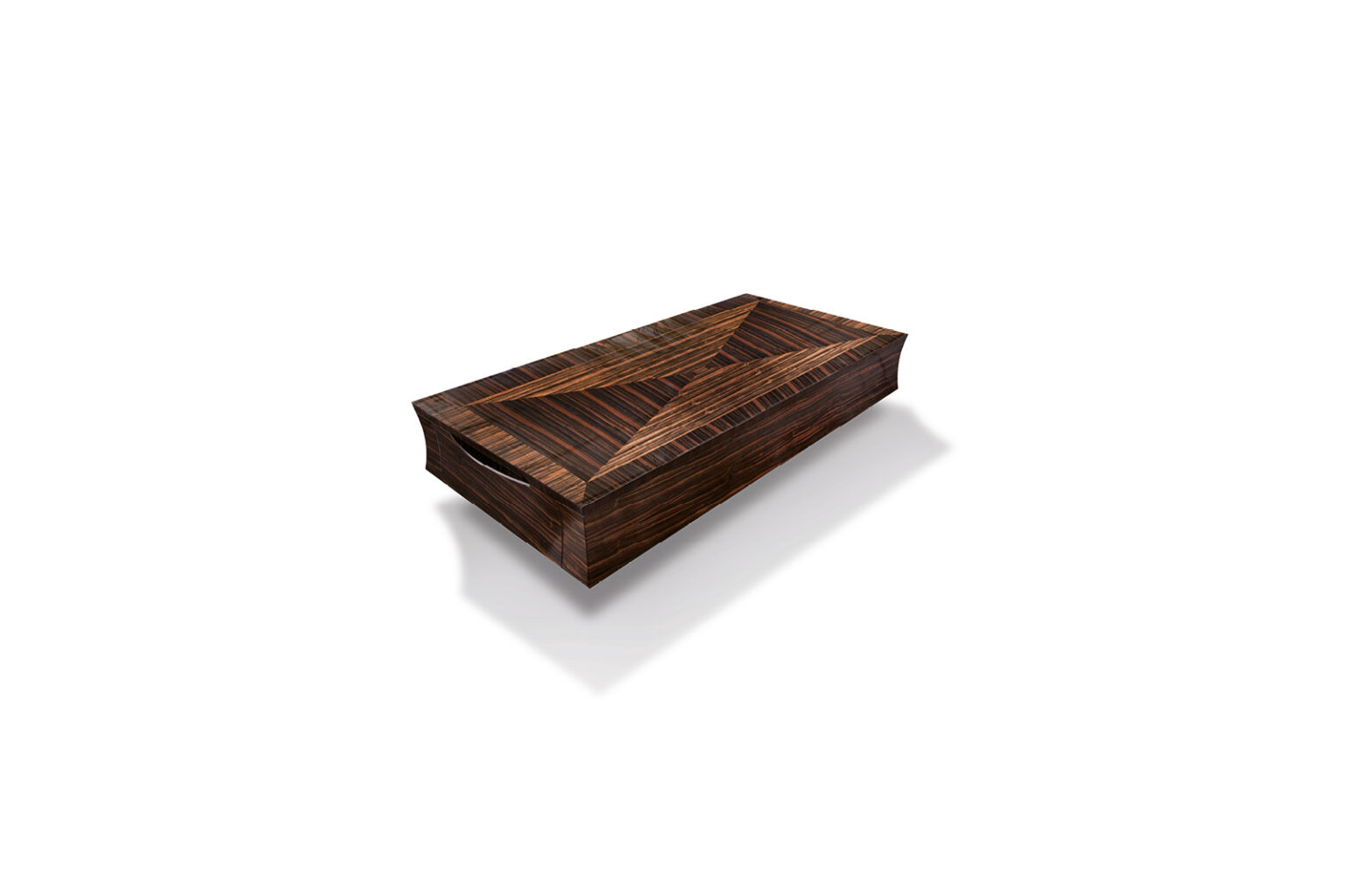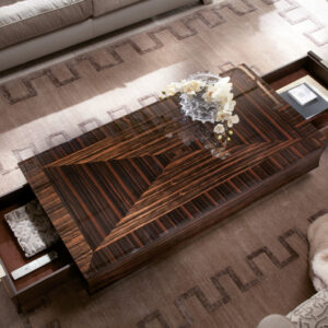Rectangular wooden cocktail table in makassar ebony veneer in satin finish. 2 full extension drawers with bottom in velvet fabric. 2 handles and base in stainless steel.