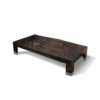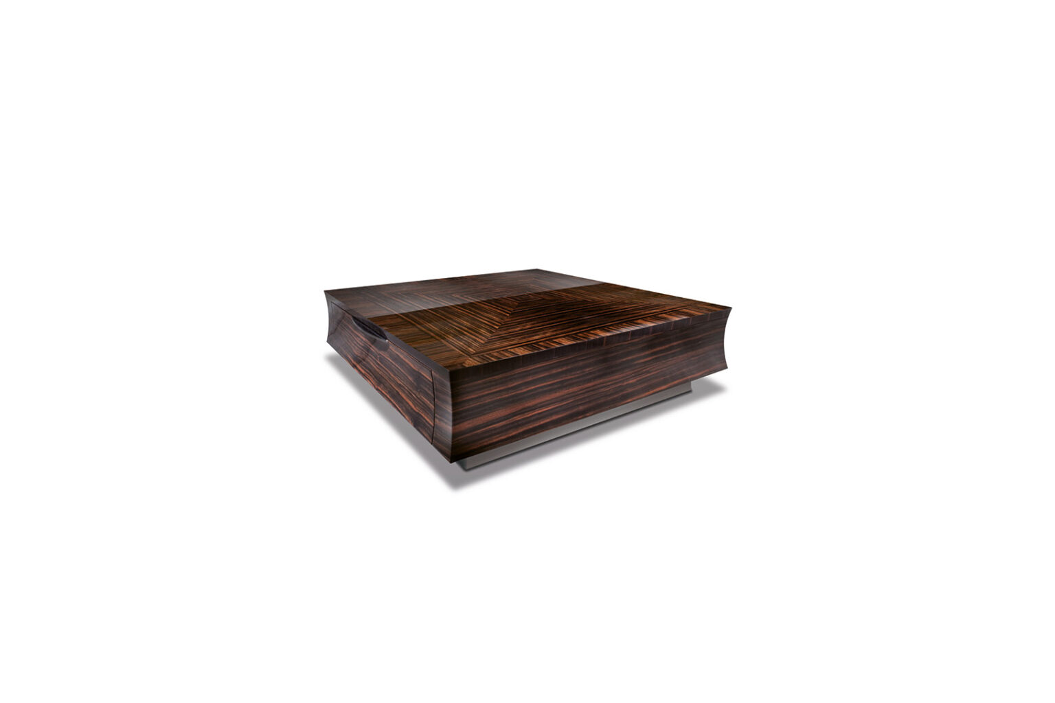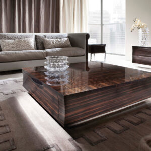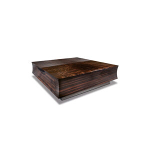 Square wooden cocktail table in makassar ebony veneer in satin finish. 2 full extension drawers with bottom in velvet fabric. 2 handles and base in stainless steel.