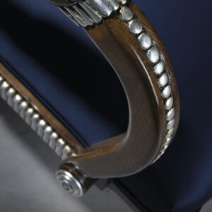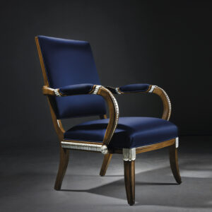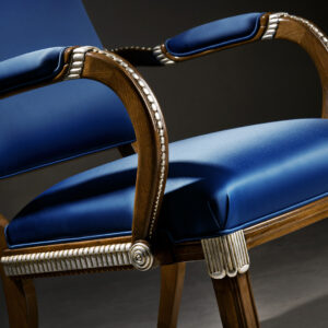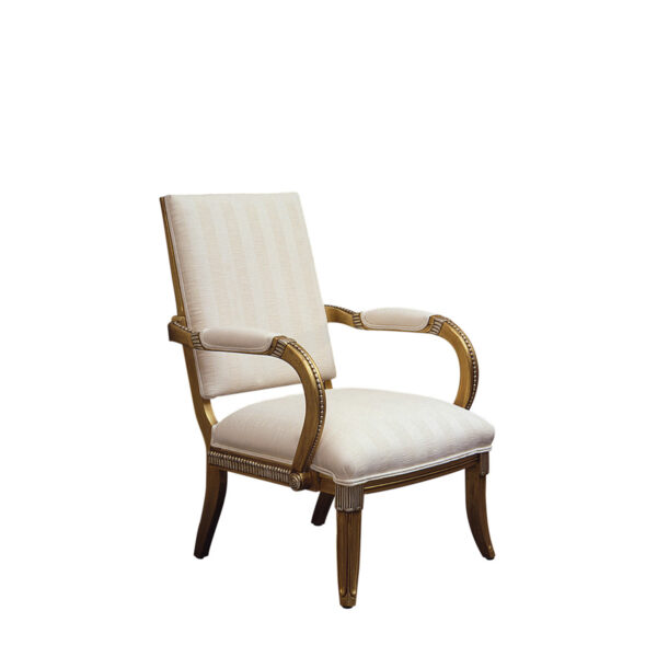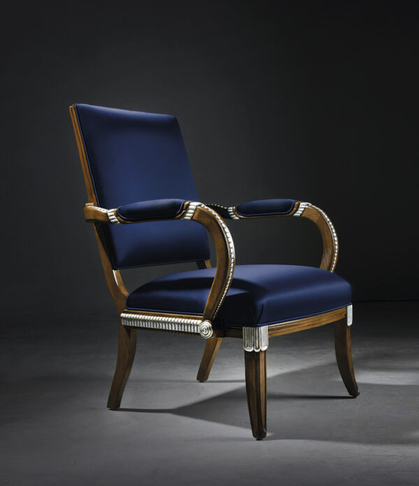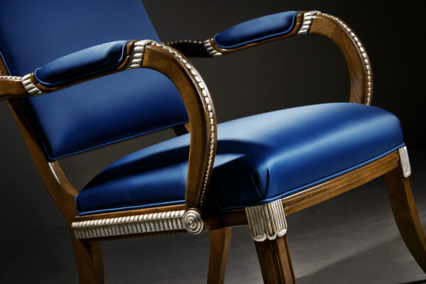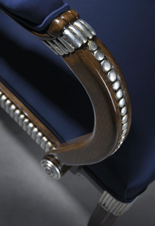 The classic Deco armchair has an elegant carved wooden structure with simple lines and sober details. The seat, backrest and armrests are upholstered. Finishes and fabrics can be customized.