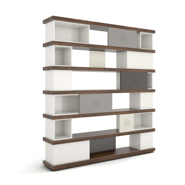 Comprising square or rectangular inserts with the option of sliding doors upholstered in leather. The structure combines shelves finished in natural tones with cracked finish inserts. Create your own composition and personalize it with an exclusive selection of finishes.