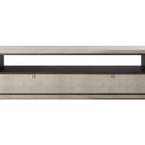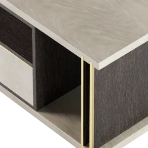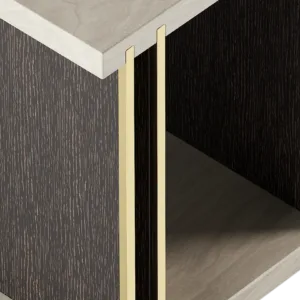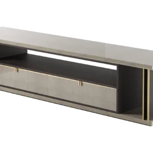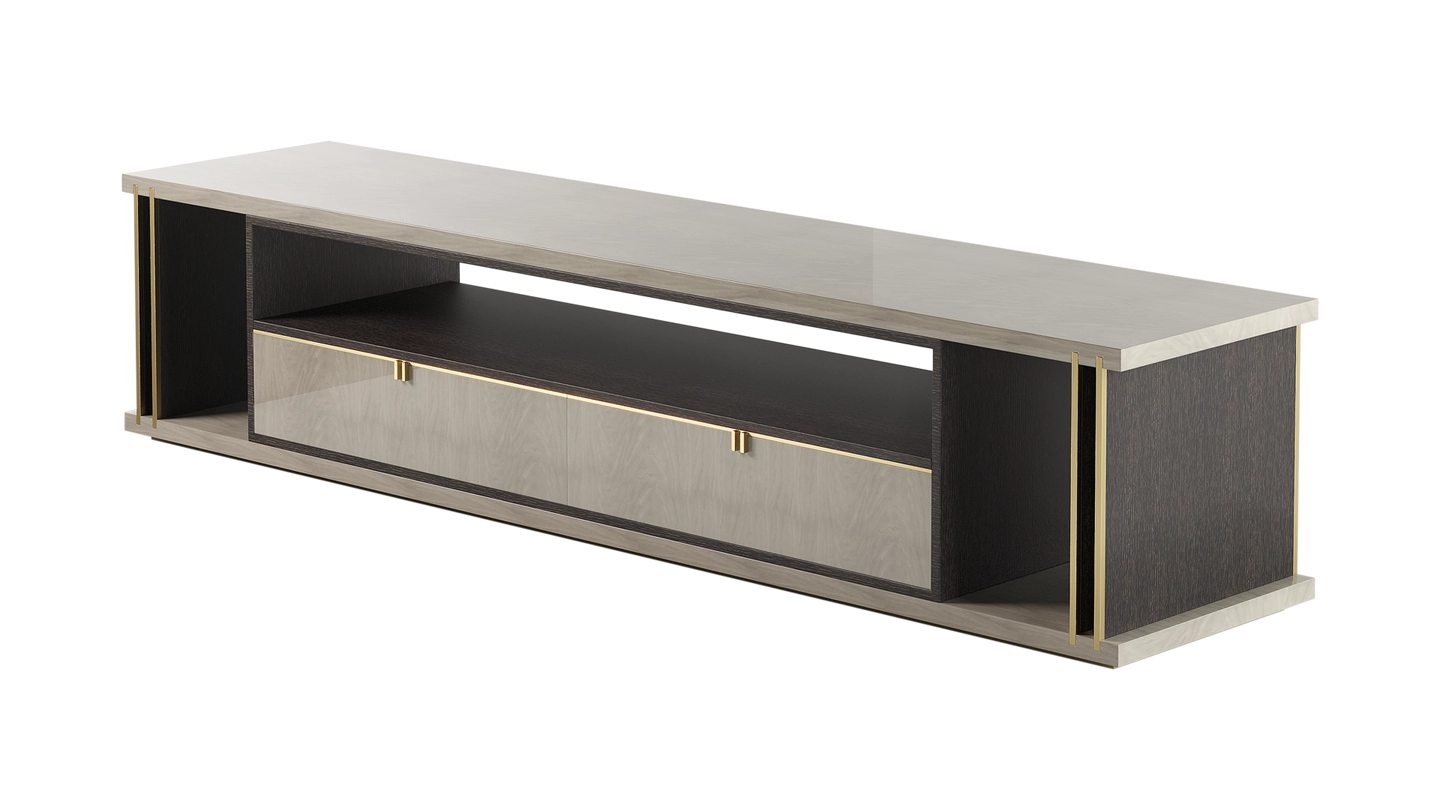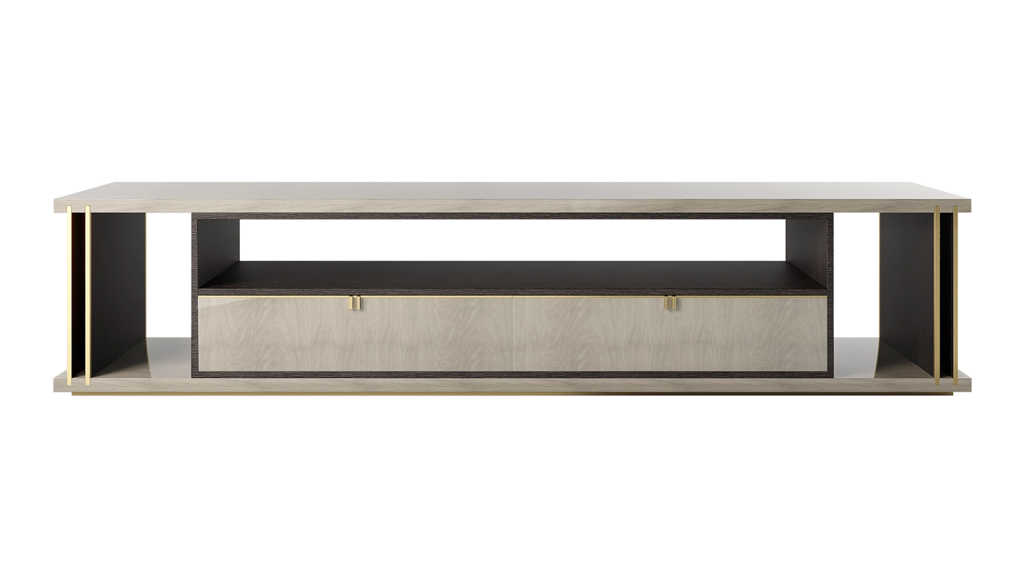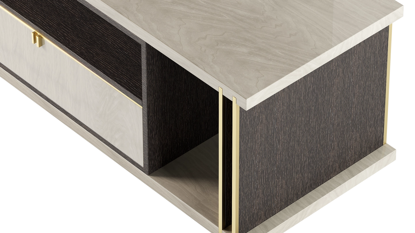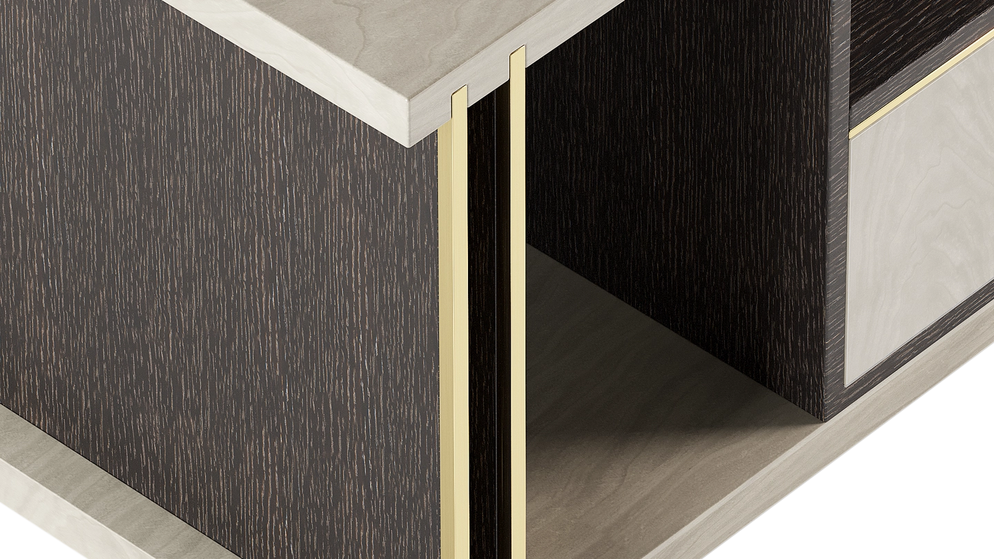 The sculptural DHAKA TV unit plays with different shades of wood veneer, contrasting the beauty of this natural material with the polish of brushed brass. Providing generous storage, the design incorporates double drawers and a mix of open shelves.